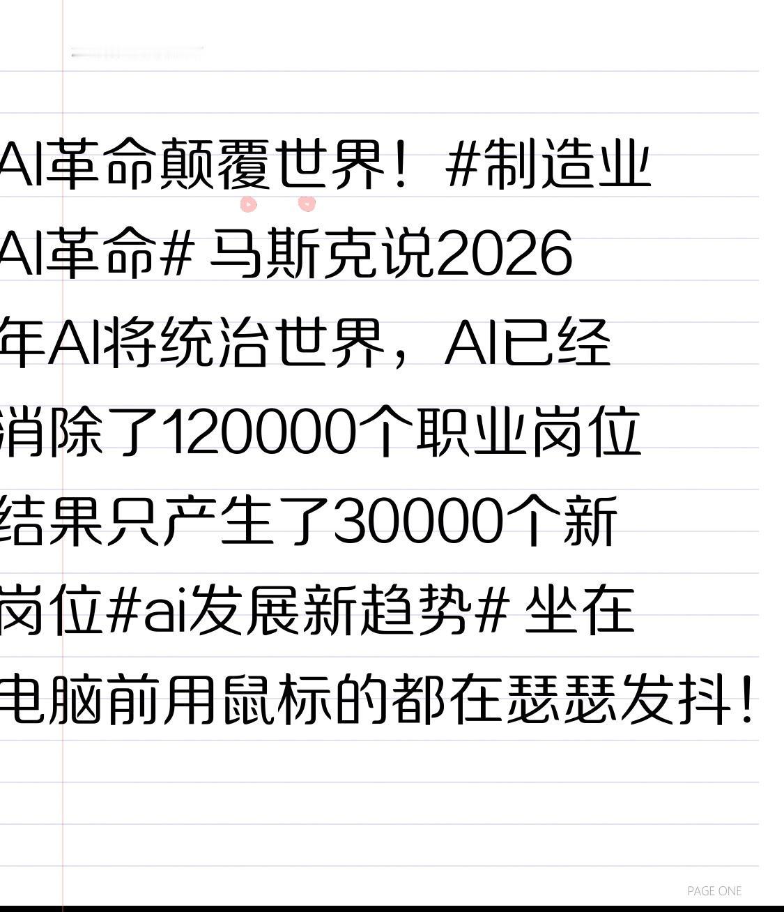 AI革命颠覆世界! 制造业AI革命 马斯克说2026年AI将统治世界, AI已经消除了120000个职业岗位 结果只产生了30000个新岗位ai发展新趋势 坐在电脑前用鼠标的都在瑟瑟发抖!