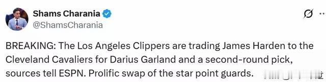 Shams重磅消息,快船队用詹姆斯哈登换来骑士队的加兰和一个2026年次轮签! 快船队鲍尔默如释重负,交易走哈登,球队更加的年轻化,在明年更多老将合同期满,快船2027年计划将走更加年轻的道路! 可以肯定的是,哈登昨天缺席,直接与管理层一块坐飞机飞往克利夫兰,这是哈登最后的冲刺! 是时候该亮出骑士球迷的身份了! 骑士早就想换走加兰了,哈登在快船季后赛都费劲,去骑士起码季后赛没问题,骑士要是能再继续做个大交易,这赛季还可以想象一下总冠军!