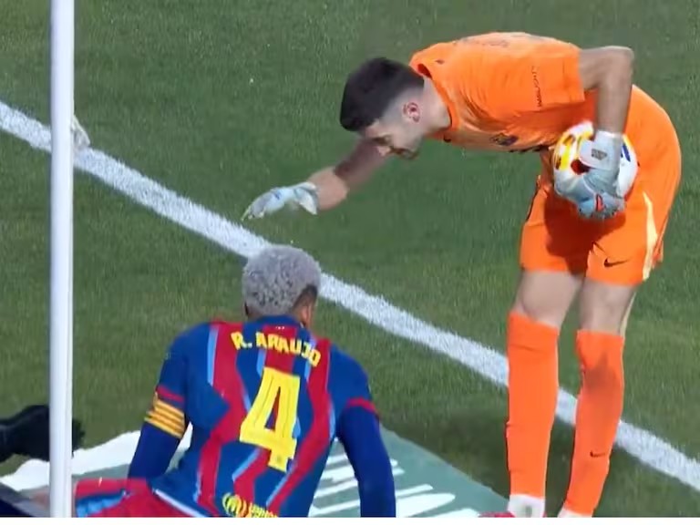 然而,正是这份真挚的情感,却意外催生了全场最“离谱”的一幕。比赛下半场,阿劳霍在一次防守中成功化解对方攻势。巴萨门将乔安-加西亚见状,抱着皮球走出球场,拍了拍还坐在地上的阿劳霍的头部,当面表示祝贺。