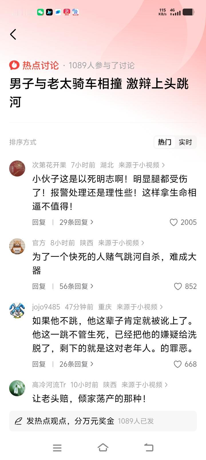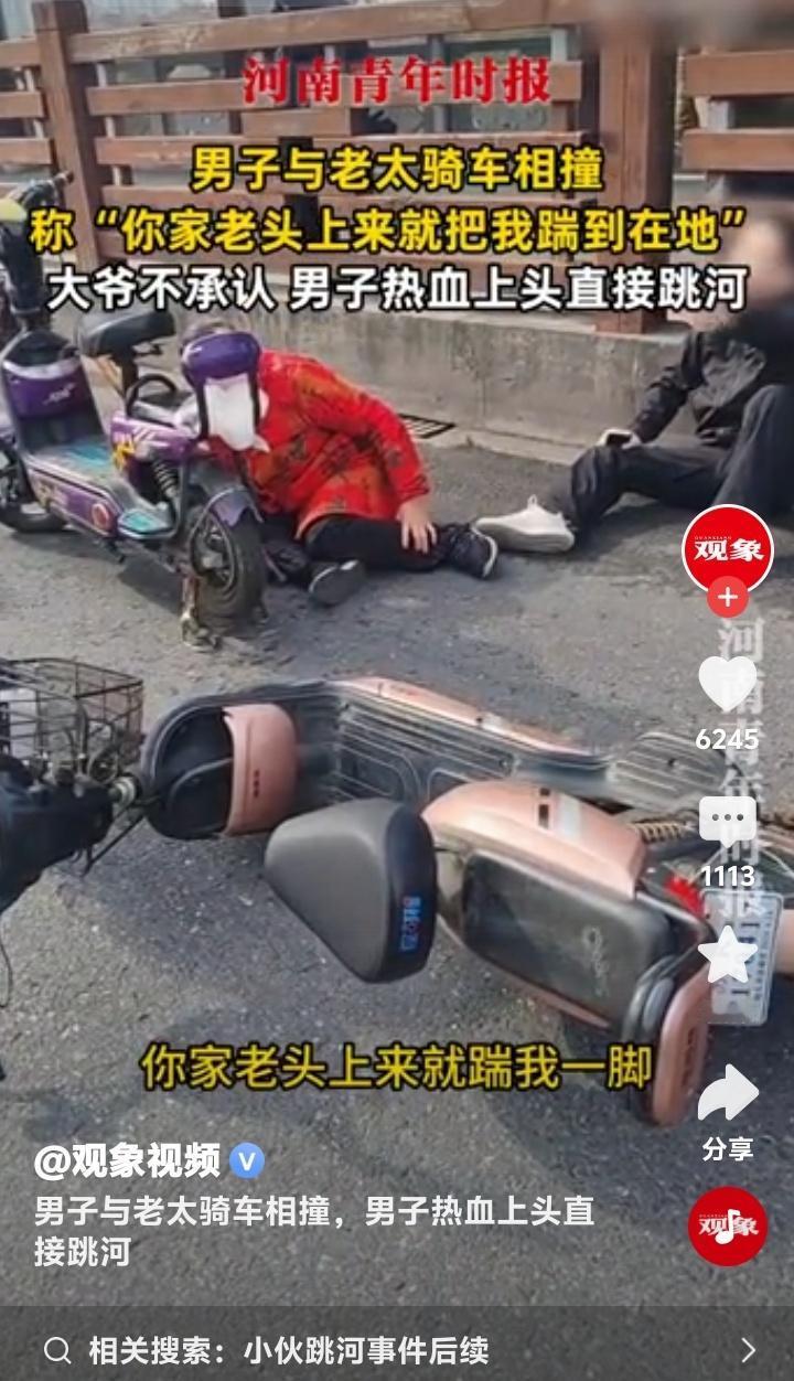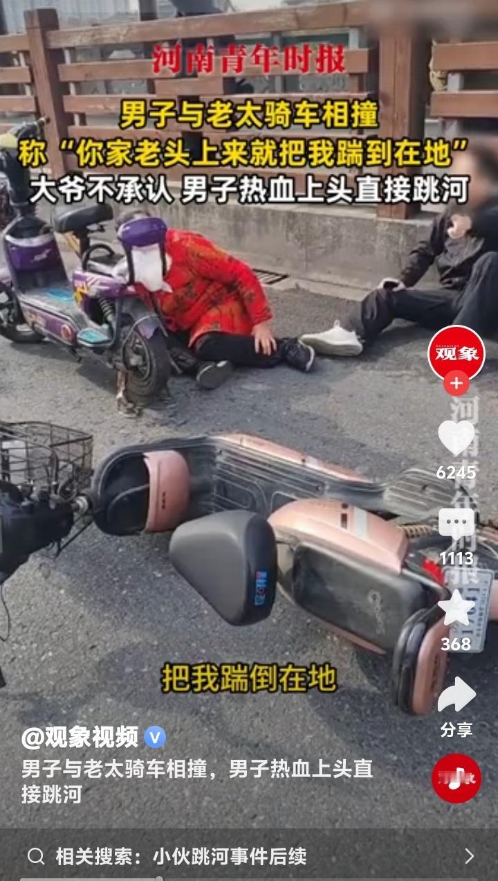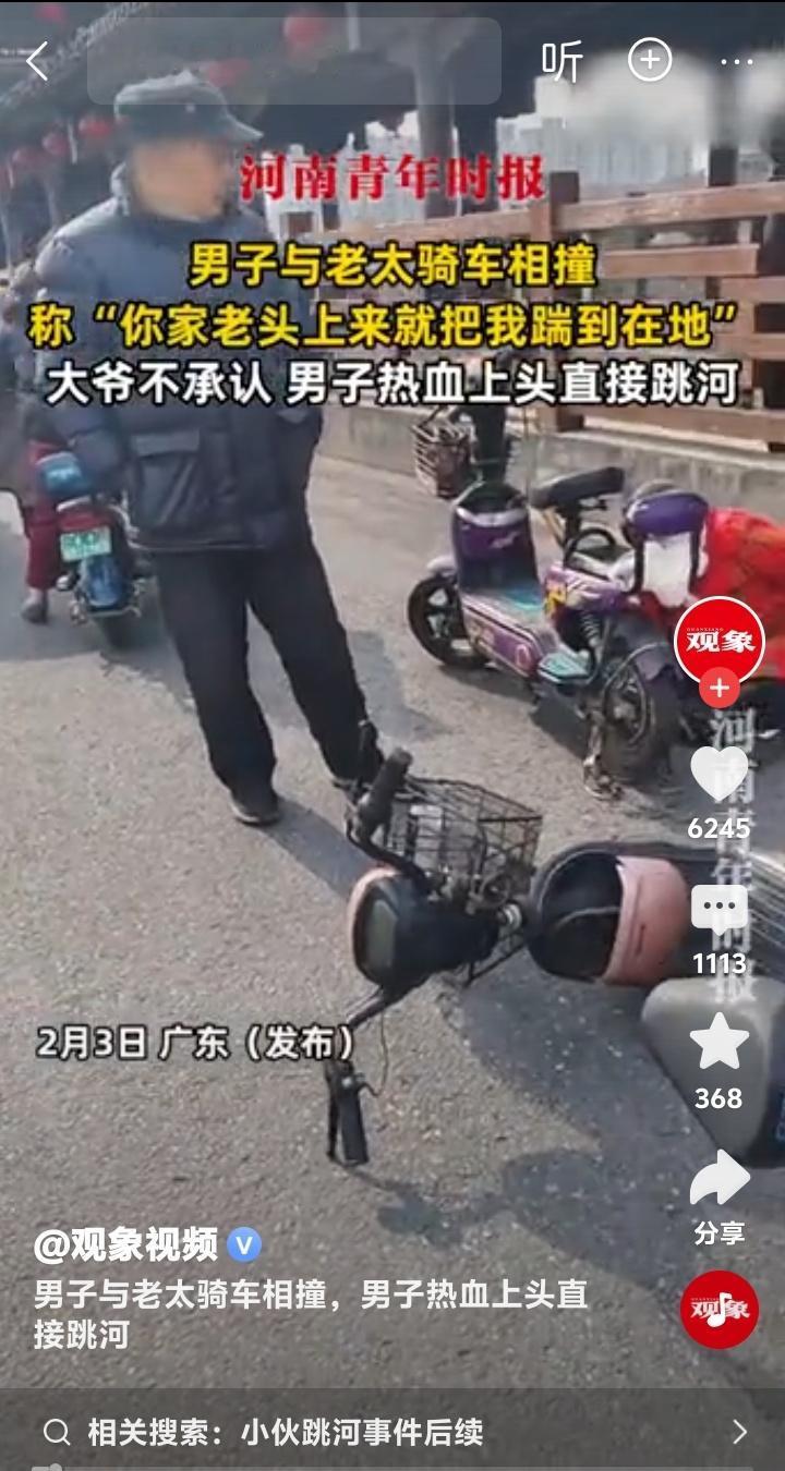扬州古运河畔惊魂一幕!年轻小伙追尾老太后遭老头飞踹,热血上头纵身跳入冰冷河水以证清白! (来源:根据网络视频及多方媒体报道整理) 二月寒风刺骨的扬州古运河边,一场小小的自行车追尾,竟演变成了一场以命相搏的“自证清白”大戏。小伙子的那一跳,激起的不仅是冰冷的水花,更是全网沸反盈天的热议与一声沉重的叹息。 画面中,小伙指着自己疼痛的腿,反复强调“是你家老头上来就踹我一脚”。而对面的老人夫妇,态度坚决地否认。公说公有理,婆说婆有理,围观者看得云里雾里,但冲突的火焰却在三言两语间窜至顶点。就在这僵持不下之际,谁都没想到,小伙子会做出如此极端的选择。 他转身,奔跑,纵身跃入了冬日刺骨的运河。那一瞬间,恐怕所有看视频的人都倒吸了一口凉气。这不是表演,而是被逼到墙角后,一种绝望而激烈的情绪宣泄。他用最危险的方式,向全世界呐喊:“我不是无赖,我只是想讨一个公道!” 幸运的是,河水没有吞噬这个冲动的灵魂,他很快自行游上了岸。但身体上的寒冷,远不及心中的寒意。这一跳,看似“胜利”地吸引了全网的关注,迫使事件必须被严肃调查,但代价何其惨烈?若有个万一,留下的将是两个破碎的家庭。 我们不禁要问,是什么把一個普通的交通事故,逼成了以死明志的悲剧?表面看,是那一脚“罗生门”般的飞踹,是争执中飙升的肾上腺素。但往深处看,是人与人之间信任基石的彻底崩塌,是“老人变坏还是坏人变老”的社会焦虑在具体事件上的总爆发。 小伙子怕什么?他怕的或许不只是赔偿,更是那种百口莫辩、被“讹上”后无穷无尽的麻烦。当理性沟通的渠道看似堵塞,当对方倚仗某些“优势”寸步不让,一个感到绝望的年轻人,竟发现“跳河”成了最快引起关注、自证清白的方式。这是个人的悲哀,更是社会调解机制失效的警钟。 事件至今,官方详细结果尚未公布。我们呼吁监控录像能给出真相,也期盼处理结果能抚平伤痕、彰显公正。法律与道德,不该在冰冷的河水中模糊。每个人都需要一个不必用极端方式就能说理的环境。 这一跳,但愿能跳醒我们对社会信任与理性解决问题的重视。让公平正义的阳光,照进每一个角落,照暖每一颗可能走向绝望的心。毕竟,一个健康的社会,不该让它的年轻人,需要用生命去赌一个“清白”。 社会信任危机 情绪管理之殇