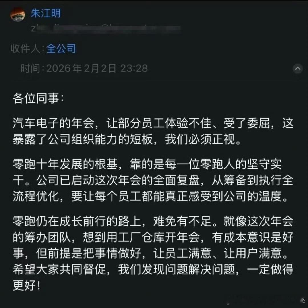 零跑年会被吐槽拉胯那个朱总有道歉的时间可以把奖金发给公司小伙伴比一封道歉信来的实