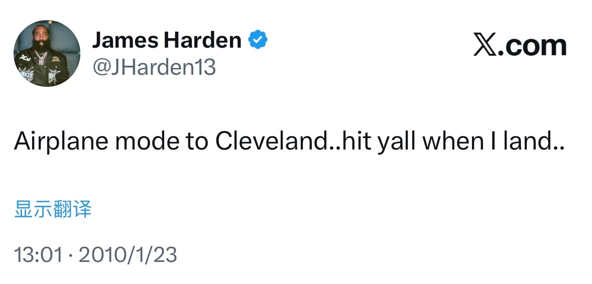 哈登2010年的推特被翻出来:飞行模式,去克利夫兰~落地了再联系!哈登加盟骑士