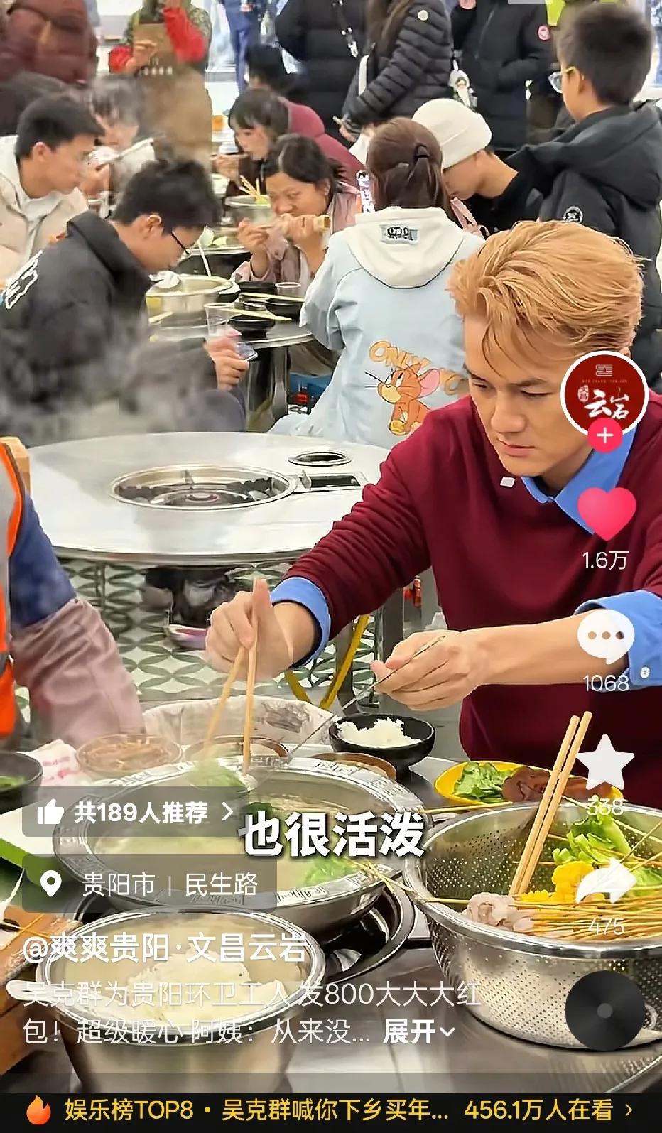 这就是明星该有的样子,吴克群很暖心,这一次请贵阳的环卫工人吃饭,还给了800块的红包🧧,本人很活泼也很随和,不做作,环卫阿姨们都很开心和感到心里暖暖的。他真的比较接地气。 我看到好多人都夸赞吴克群,对他本人的印象很好,像是邻居家的大哥哥,这800块钱对于环卫工人来说,是对她们平时为这个城市默默付出的认可和敬意! 感恩相遇,都是善良可爱的人,新年快乐,大家。