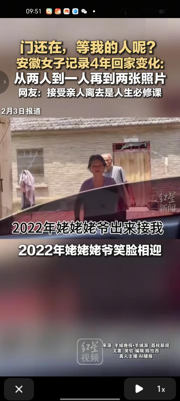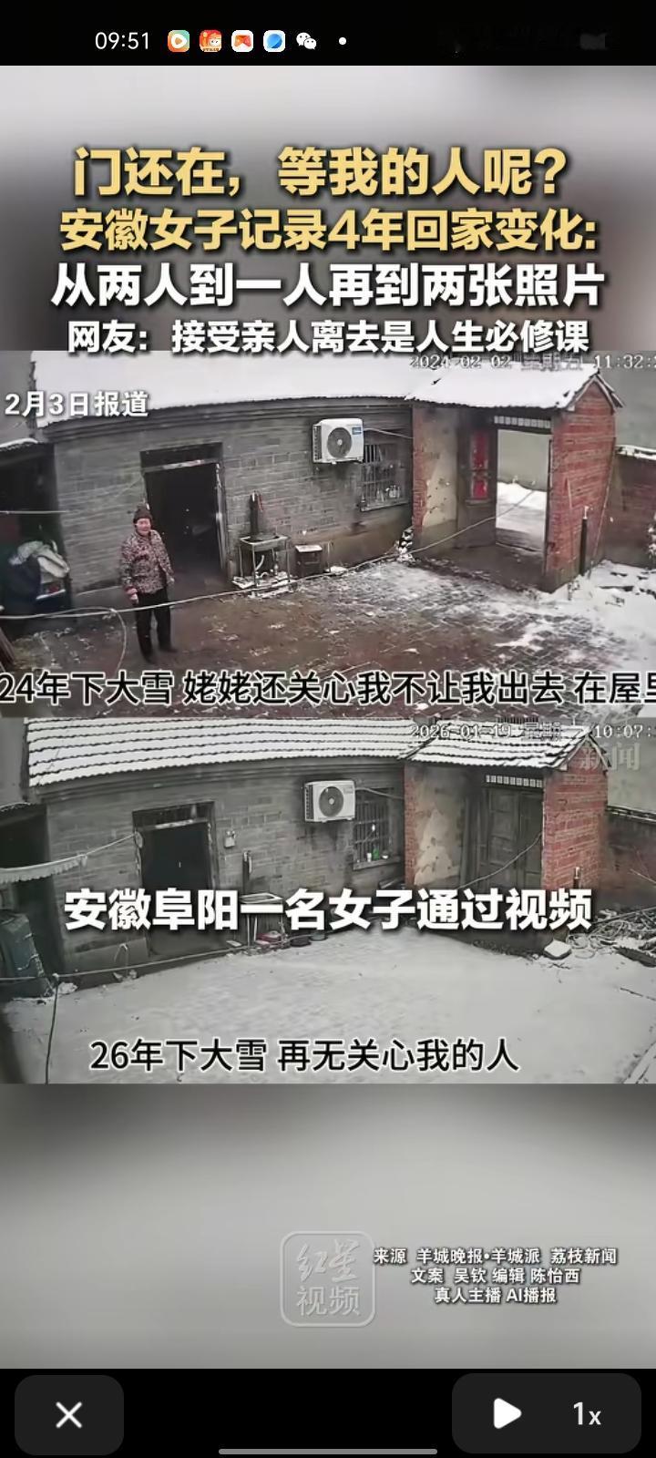 1月31日,阜阳市太和县。女子分享四年间回家场景的变化,2022年姥姥姥爷笑脸相迎,2024年仅剩姥姥一人等候,2026年家中只有两个老人遗照,配文:再无人早早在门口等待引发广泛共鸣。网友表示,接受亲人离去是人生的必修课 确实,他们曾为你点亮一盏灯、守着一扇门,如今换我们把爱与思念好好安放。不必强迫自己立刻释怀,允许悲伤慢慢流淌,也记得带着他们的期盼好好生活。好好吃饭、好好赶路、好好爱身边的人,就是对离去者最好的告慰。