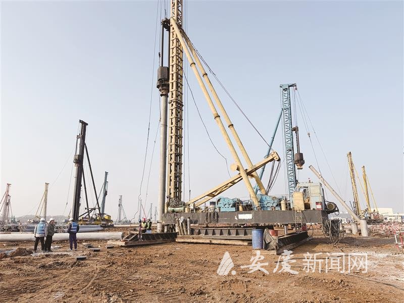 此外,管桩供应与转运的难题,同样在专班的协调下迎刃而解。项目采用全预应力管桩施工,管桩用量达109万米,是安庆市目前为止单次管桩用量最大的项目。为保障材料供应,项目采用“陆运+水运”的运输模式,而水运环节中,材料卸货成为亟待解决的难题。为此,经开区管委会积极对接港务公司,为项目协调3个稳定泊位,专门用于管桩等施工材料的停靠卸货,确保材料快速转运至施工一线,保障了施工的连续性。“港口专属泊位让运输效率显著提升,有效避免了材料积压延误工期。”杨晴瑞说。