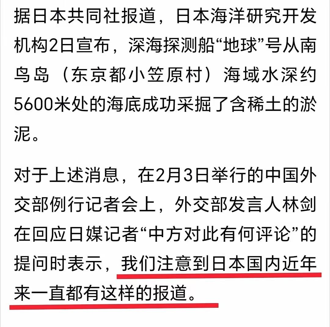 日本首相高市早苗,2日激动的发推宣布:日本在南鸟岛6000米海底,发现了稀土泥, 恭喜日本,已经达到了中国1934年的水平,这一年,中国科学家何作霖在包头发现了稀土泥, 虽然还有近百年的发展之路,虽然最近15年日本的稀土精炼毫无变化,但毕竟已经开始了,是不是? 中国外交部发言人的回应侮辱性极强,他说:日本多年来一直有这样的报道, 可惜的是,伴随着日本经济30年的停滞,国民和舆论也逐渐低智化,高市早苗发推的评论区,日本网友欢呼雀跃,仿佛明天就能摆脱中国的“稀土讹诈”, 最新消息,高市早苗在最新的选举中,大胜已成定局。