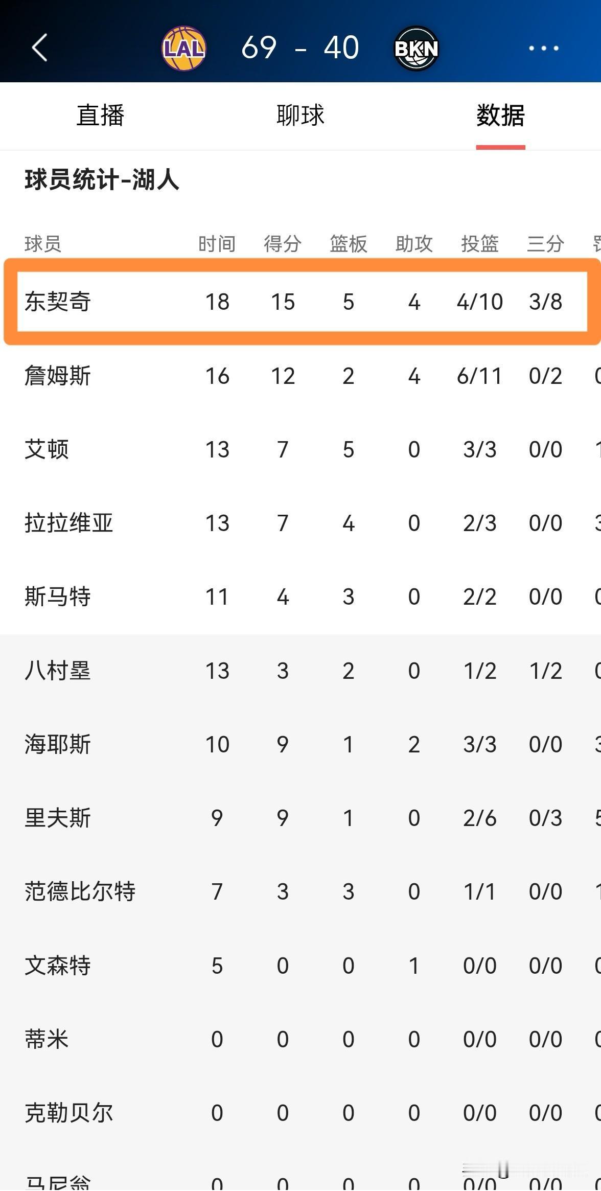 湖人巨星东契奇真是太反常了!在今天湖人客场挑战篮网的比赛中,目前双方半场战罢,湖人以69:40领先对手。在前两节比赛中,东契奇一反常态并没有展现出非常强的进攻欲望,他在首发出战的18分钟里,投篮10中4,其中三分球8中3、罚球6中4仅仅得到15分,还有5篮板4助攻1抢断,他的场上正负值为+18。 坦白说,今天东契奇在上半场比赛中的表现和以往相比真是太普通了,两节比赛下来他才得了15分。
