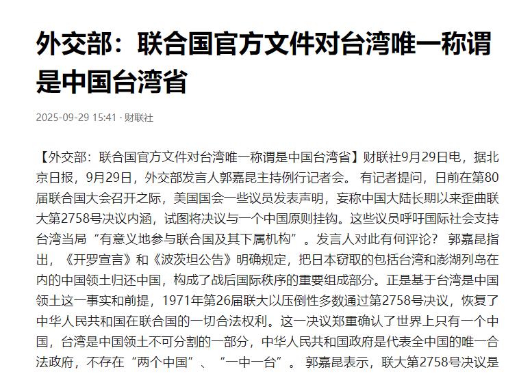 既然执意玩火、自绝退路,那就不必再留半分情面! 中方外交已经把底线彻底摊开,从今往后,国际场合涉及台湾的官方表述,唯有中国台湾省这一个合法称谓,所有模棱两可、夹带私货的模糊说法,都将被彻底清零。 中方这次在外交上对台湾问题的强硬表态,可不是心血来潮,而是有着实实在在的法理依据和现实考量。先从国际法层面来说,1971年联合国大会第2758号决议明确说了,世界上只有一个中国,中华人民共和国政府是代表全中国的唯一合法政府,台湾是中国领土不可分割的一部分。 这可不是随便说说的,联合国所有官方文件提到台湾时,用的都是“中国台湾省”这个称谓,连联合国秘书处的法律意见都白纸黑字写着,台湾作为中国的一个省没有独立地位,台湾当局也不享有任何政府地位。也就是说,在国际社会的主流认知里,台湾从来就不是一个国家,这是二战后国际秩序的重要组成部分,是铁一般的事实。 那些试图在国际场合给台湾搞模糊表述的行为,说白了就是在挑战二战胜利成果和战后国际秩序。就拿美国来说,虽然嘴上也承认一个中国原则,但时不时就想在台湾问题上搞小动作,又是对台军售,又是推动所谓“台湾参与国际组织”,甚至还在一些官方文件里玩文字游戏,把台湾称为“国家”或者“独立政治实体”。 这种表里不一的做法,不仅违反了中美三个联合公报的规定,更是对国际法和国际关系基本准则的公然践踏。中方这次把话说死,就是要彻底堵住这些人的歪路,让他们再也没有空子可钻。 再看看台湾岛内的情况。民进党当局这些年来一门心思搞“台独”,又是修改教科书搞去中国化教育,又是勾连外部势力挑战大陆底线。可结果呢?他们越折腾,台湾民众对大陆的认同感反而越强。 就拿中美贸易战来说,美国一开始威胁要对中国加征高额关税,结果大陆这边硬气地反制回去,台湾民众不仅没有被美国的威胁吓倒,反而在社交媒体上一边倒地支持大陆。很多台湾网友都说,大陆这次让美国看到了什么叫“大国底气”,反观民进党当局,只会跟着美国屁股后面跑,把台湾的利益当成筹码来换美国的“保护”,实在是太没骨气了。 更有意思的是,民进党当局越是搞“去中国化”,台湾民众对中华文化的认同感就越强。每年春节、中秋这些传统节日,台湾各地的灯会、庙会照样热热闹闹,闽南语歌曲、布袋戏这些传统文化在台湾也一直很受欢迎。 就连民进党自己搞的一些所谓“本土文化”活动,也离不开中华文化的影子。这说明什么?说明台湾同胞骨子里就流淌着中华血脉,不管民进党怎么折腾,都改变不了两岸同根同源的事实。 从现实角度来看,大陆这些年的发展有目共睹。经济上,大陆已经是世界第二大经济体,GDP总量是台湾的22倍还多,在科技、军事等领域也取得了长足进步。这种实力上的差距,让越来越多的台湾民众认识到,只有和大陆站在一起,台湾才有更好的发展前景。 再看看国际社会的态度。现在已经有183个国家和中国建立了外交关系,这些国家都明确承认一个中国原则。就连一些曾经和台湾有“邦交”的国家,也在近年来纷纷转向和中国建交。这说明,国际社会的主流是支持一个中国原则的,那些试图为台湾搞特殊待遇的国家,只会越来越孤立。 比如立陶宛,之前不顾中方反对,允许台湾在其境内设立所谓“代表处”,结果遭到中方的严厉反制,经济上损失惨重。这件事给其他国家提了个醒,在台湾问题上玩火,是要付出代价的。 中方这次在外交上的强硬表态,也是对“台独”势力的一次严重警告。这些年来,“台独”分子越来越嚣张,不仅在岛内搞各种分裂活动,还试图拉拢外部势力干涉中国内政。他们以为有美国撑腰,就可以为所欲为,却忘了中国政府和人民捍卫国家主权和领土完整的决心是不可动摇的。 《反分裂国家法》早就明确规定,国家绝不允许“台独”分裂势力以任何名义、任何方式把台湾从中国分裂出去。如果“台独”分子执迷不悟,继续玩火,中方必将采取一切必要措施,包括非和平方式及其他必要手段,来捍卫国家的统一。 有人可能会说,中方这么强硬,会不会影响两岸关系的和平发展?其实不然。中方一直强调,我们愿意以最大诚意、尽最大努力争取和平统一的前景,但前提是必须坚持一个中国原则和“九二共识”。 如果民进党当局愿意回到一个中国原则的基础上来,两岸完全可以通过对话协商解决问题。但如果他们继续坚持“台独”立场,那么中方的强硬反制就是必要的,这不仅是为了维护国家的主权和领土完整,也是为了保护台湾同胞的根本利益。 总的来说,中方这次在国际场合对台湾官方称谓的明确表态,是基于国际法、历史事实和现实情况的必然选择。 随着中国综合国力的不断增强,解决台湾问题、实现祖国完全统一的历史进程必将加快。在这个过程中,任何试图阻碍中国统一的势力都将被历史的车轮碾碎,两岸同胞携手共创美好未来的日子已经越来越近了。