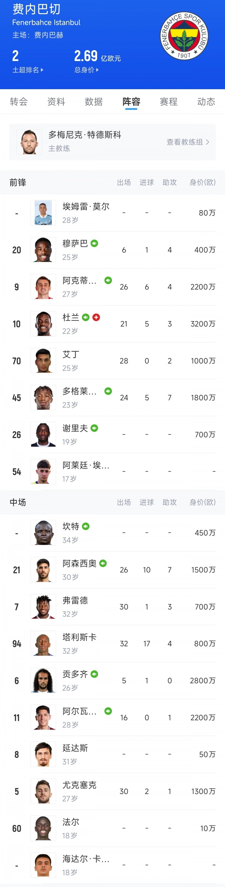 费内巴切阵容配置一览: