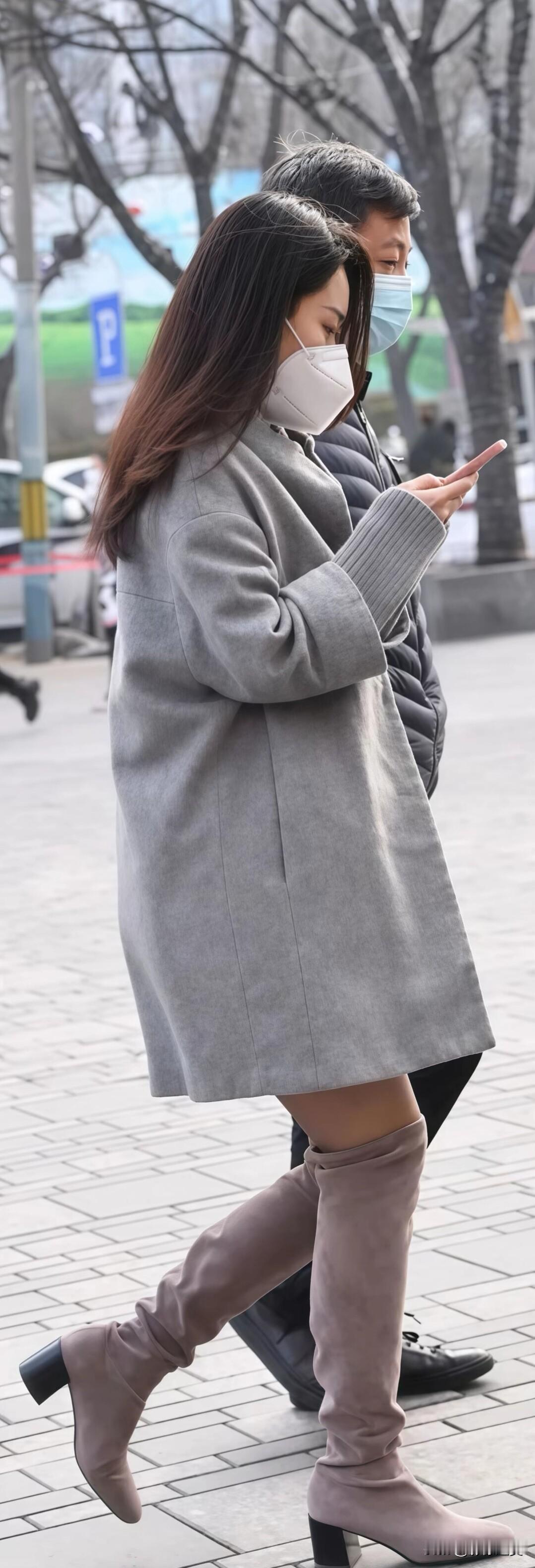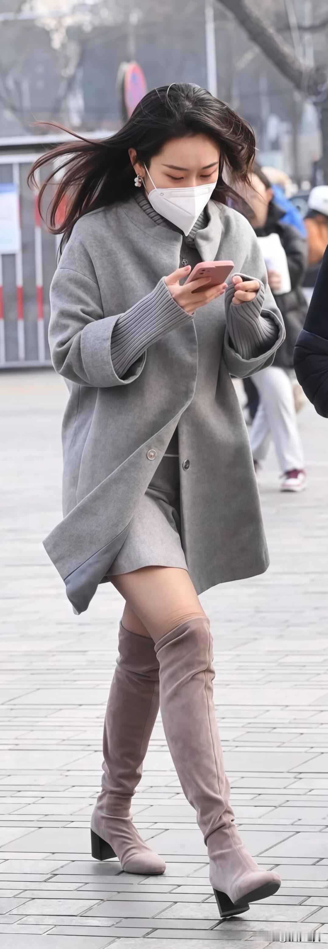 一身同色系灰色穿搭太显质感啦!宽松大衣配短裙和过膝靴,保暖又利落,日常出街这么穿