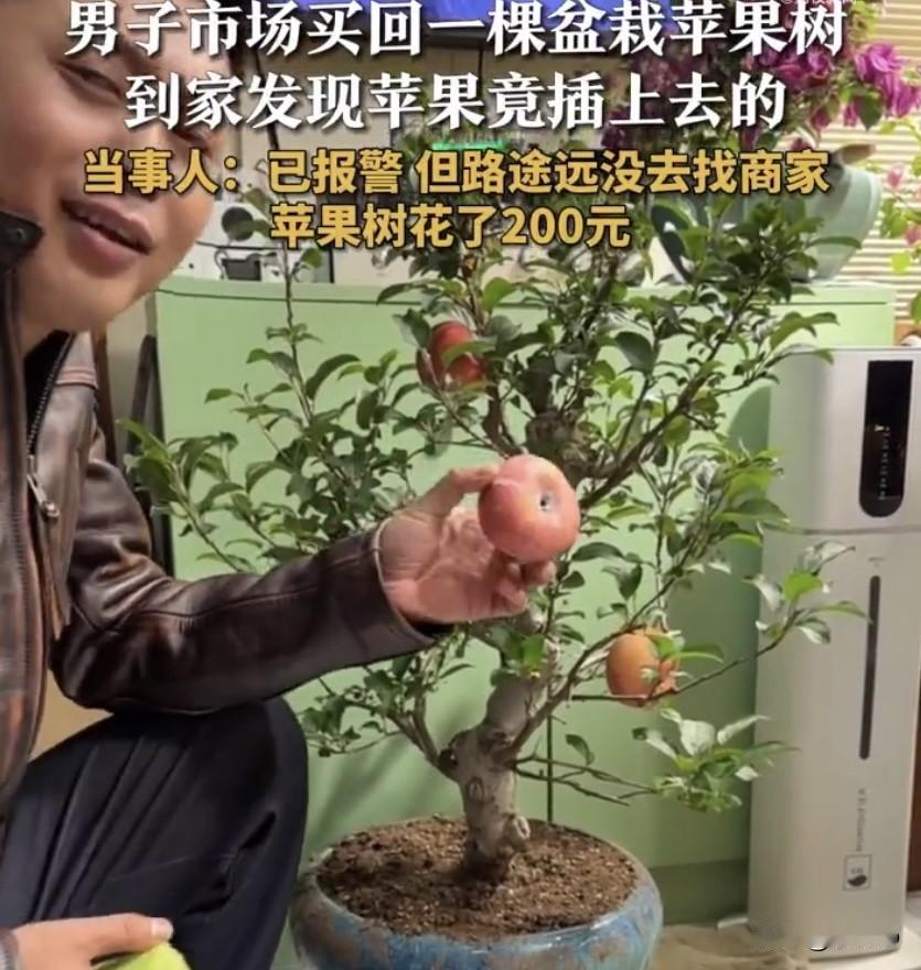 天津一位大哥在市场花200块买了棵盆栽苹果树,本想着摆家里既能观赏又能等着吃果子,结果到家一细看直接傻眼,树上结的苹果居然全是用螺丝拧上去的,这波离谱操作直接把大哥整懵,最后气得直接报了警,这事也让网友直呼活久见,这年头买棵果树都能踩这么大的坑。何先生本来就是想着家里添点绿植,盆栽苹果树又能看又能吃,性价比看着挺高,在市场里看到这棵树时,枝头上挂着红彤彤的苹果,看着硕果累累的样子特别喜人,一问价格200块,觉得不算贵,当场就掏钱买了下来,一路上还美滋滋想着以后能吃到自家结的苹果。谁知道到家后,弟弟好奇想摸摸树上的苹果,一拿竟发现不对劲,苹果根本不是长在树枝上的,背后居然拧着小螺丝,牢牢固定在树干上,兄弟俩赶紧检查整棵树,这才发现所有苹果都是人工插上去的,妥妥的“人工造果”,好好的盆栽树直接变成了摆设。发现被骗的何先生又气又无奈,自己花200块买的不是结果的苹果树,而是个被精心“伪装”的假果树,任谁遇上这事儿都得膈应。他第一时间就报了警,想着能讨个说法,可无奈的是,买树的市场离得太远,来回折腾太麻烦,最后也没能亲自去找商家对峙,只能吃了这个哑巴亏。事后何先生把这事分享到网上,瞬间引发网友热议,大家都被商家这波奇葩操作逗乐了,纷纷调侃这是“科技与狠活”走进了花卉市场,还有人吐槽商家的造假手段也太敷衍,用螺丝拧苹果也不知道藏隐蔽点,简直把买家当傻子糊弄。有网友留言说自己也踩过类似的坑,买的盆栽水果树全是假果,还有人支招以后买果树一定要当场掰一掰果子,避免再被骗。也有不少网友觉得又好气又好笑,200块买个教训确实不值,同时也吐槽部分商家为了赚钱毫无底线,连这种小生意都要耍小心思造假。这事儿也给大家提了个醒,不管是买盆栽还是其他东西,都要多留个心眼,仔细检查,避免被商家的小伎俩蒙骗,毕竟谁也不想花真金白银,买个徒有其表的“假货”回家。苹果树鉴别 观赏苹果树 来源:荔枝新闻