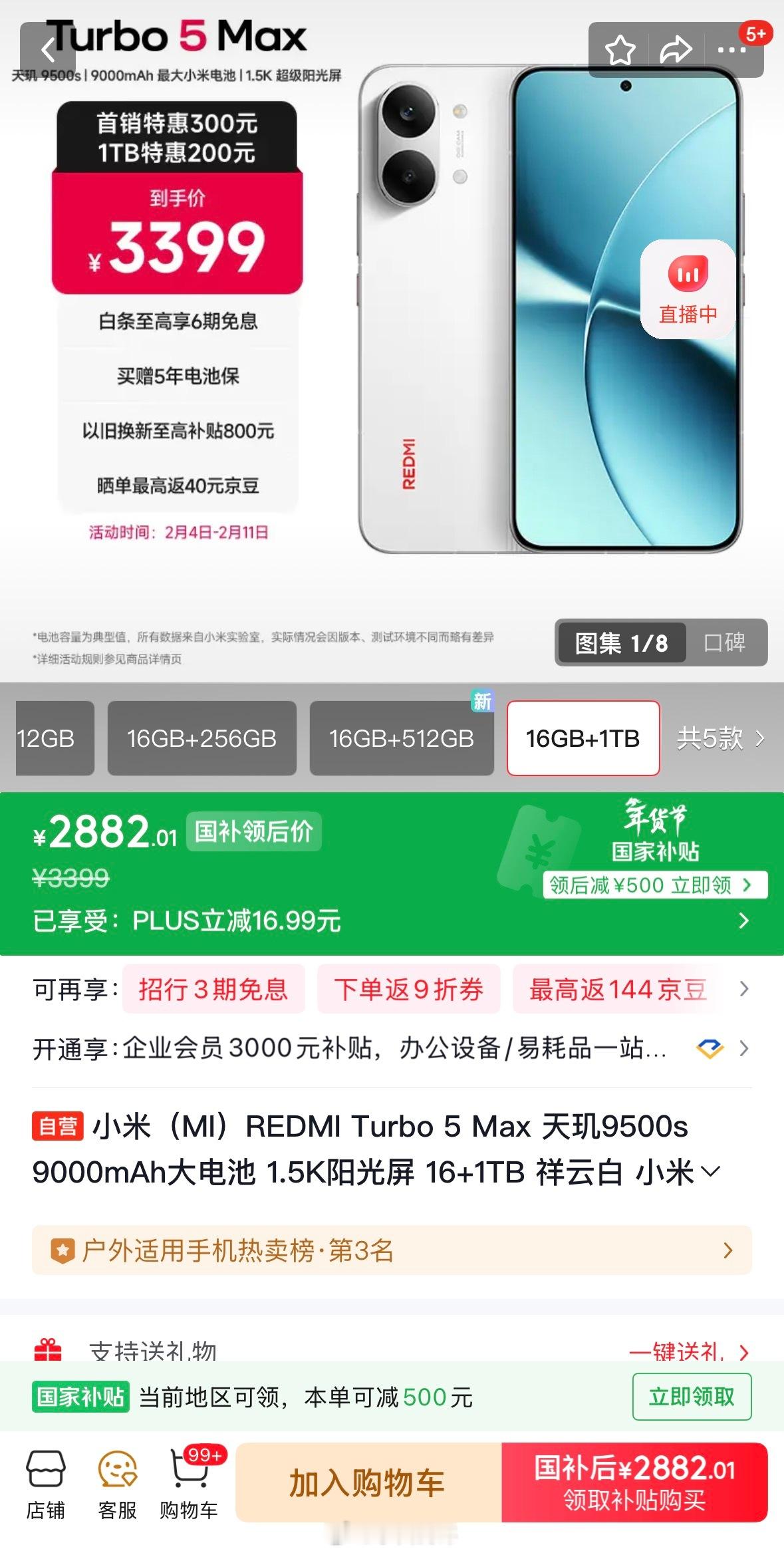 红米Turbo 5 Max宣布新增16GB+1TB版本首销价3399元(某东Plus国补后2882.01)