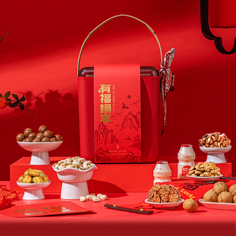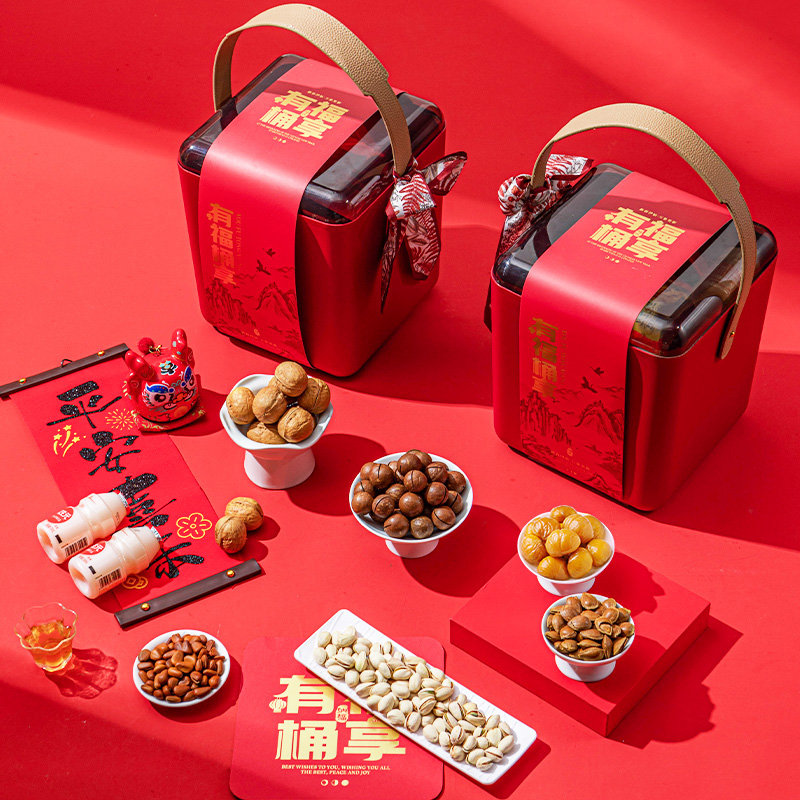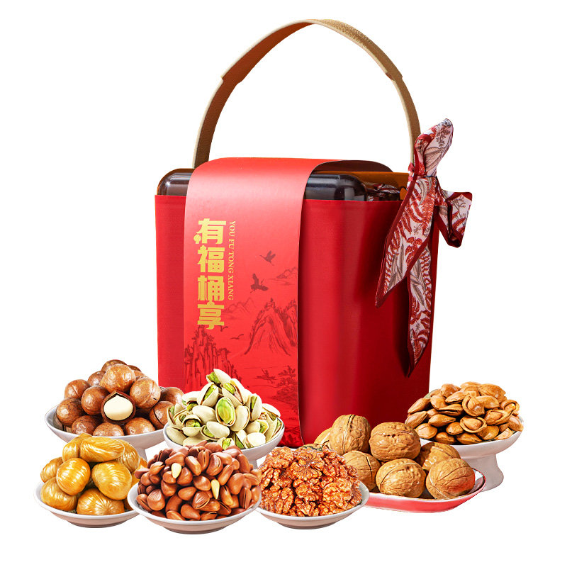 【恭喜发财暴富桶】坚果礼盒,通体喜庆中国红,搭配烫金“恭喜发财”、“一夜暴富”等潮流吉祥话,开箱即获视觉暴击,区别于传统礼盒,创新采用“财富桶”设计,寓意“桶满钵满”,实用美观两不误,哑光材质+精致浮雕工艺,手感出众,送礼倍显体面。多种明星坚果黄金配比:内含巴旦木、核桃、腰果、夏威夷果、碧根果、开心果、榛子、兰花豆款款饱满,低温慢焙锁住原香,轻盐/原味两种经典风味,健康无负担,拜年时拎一桶,高端大气,寓意“合作暴富”,下单还送丝巾。【恭喜发财】高档坚果礼盒零食过年节日送礼送长辈年货团购批发品