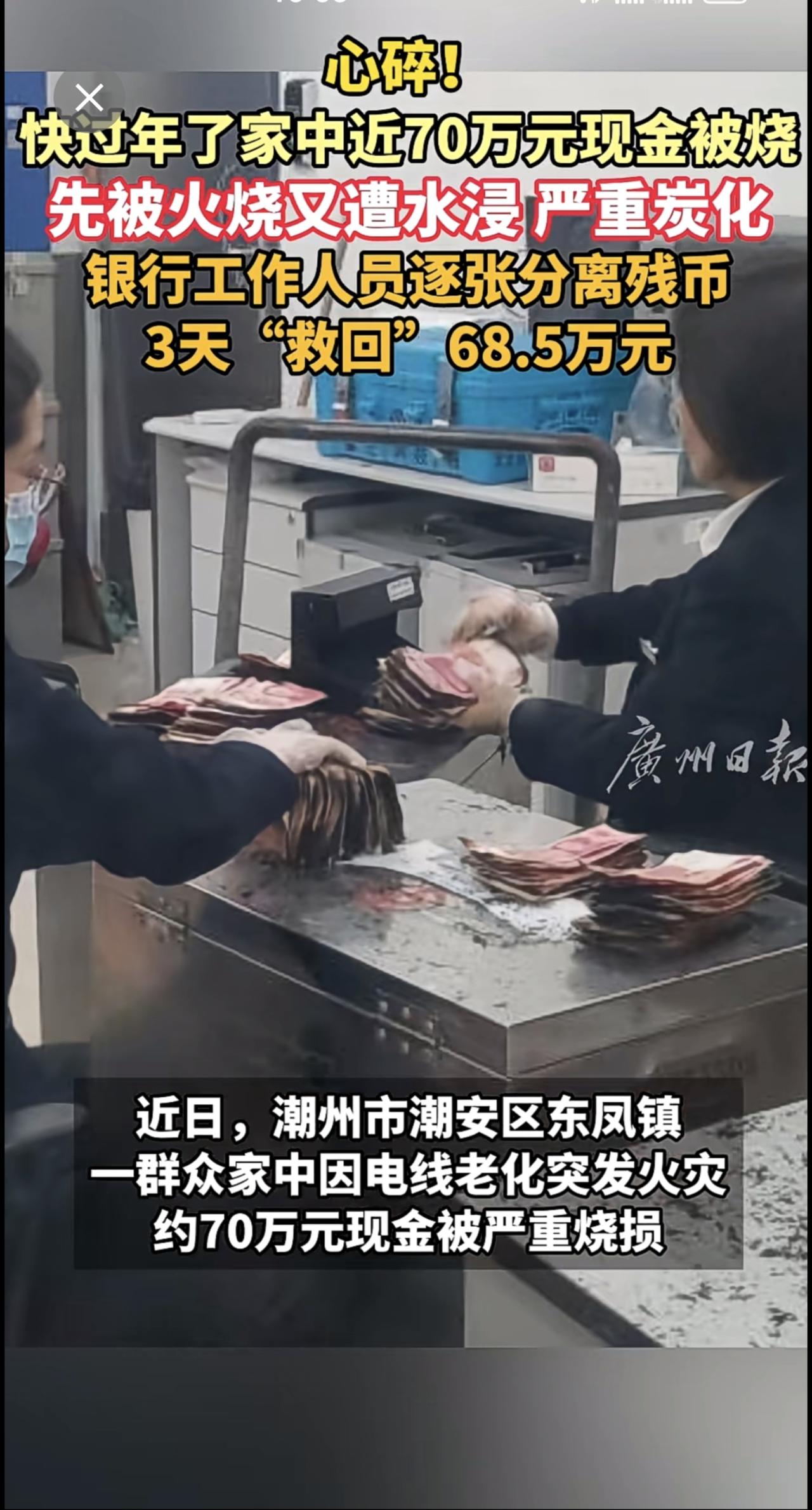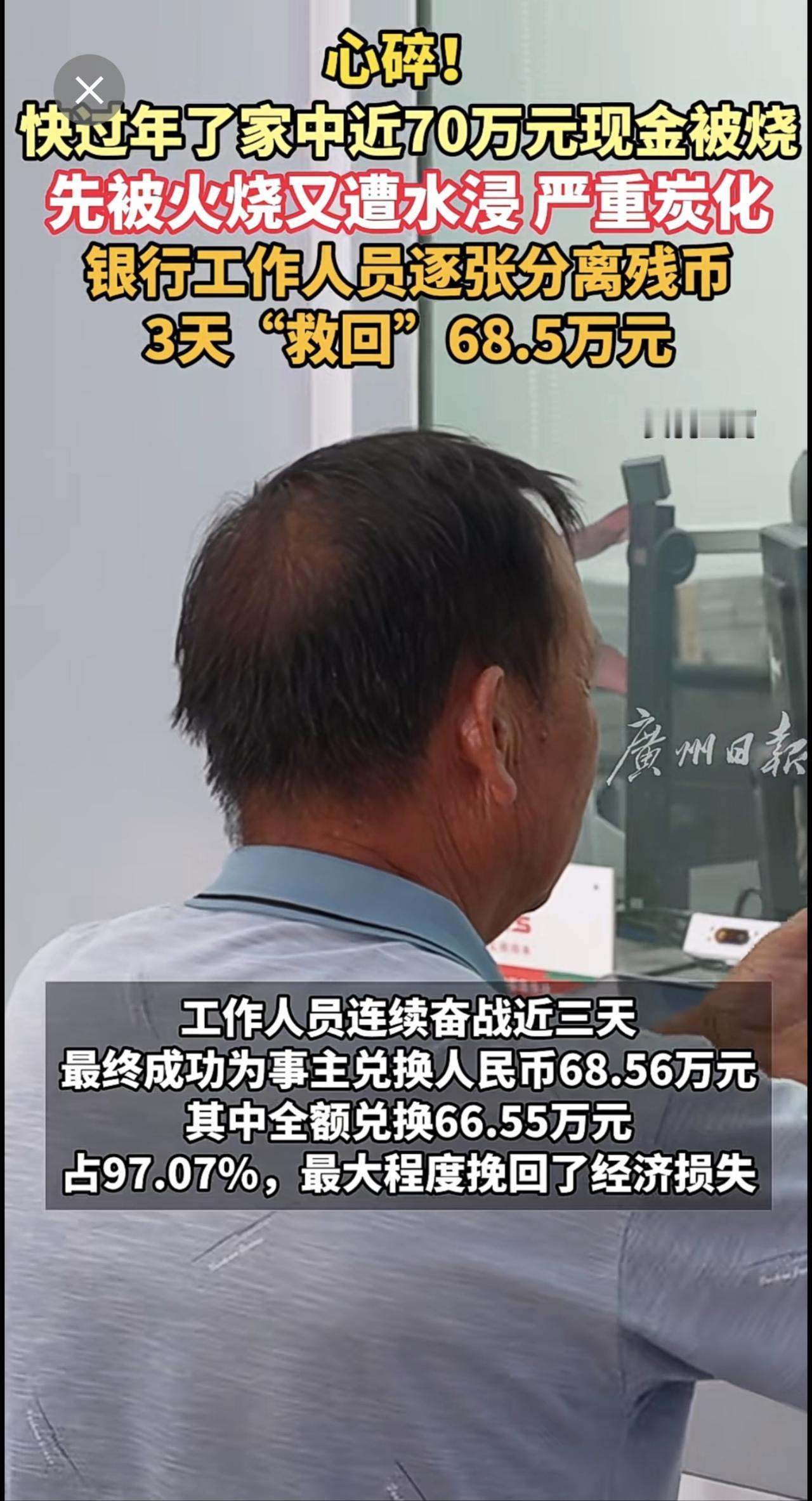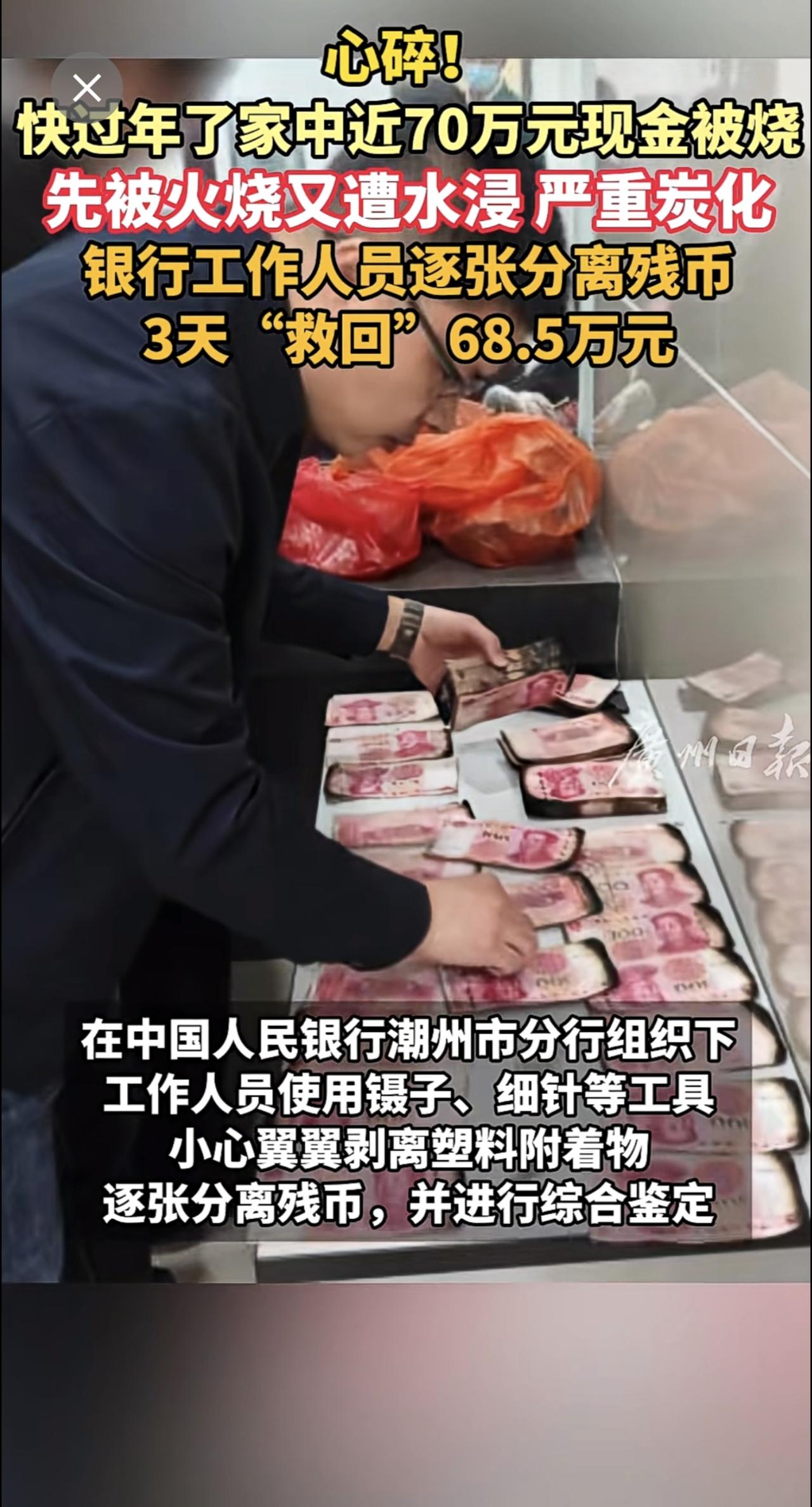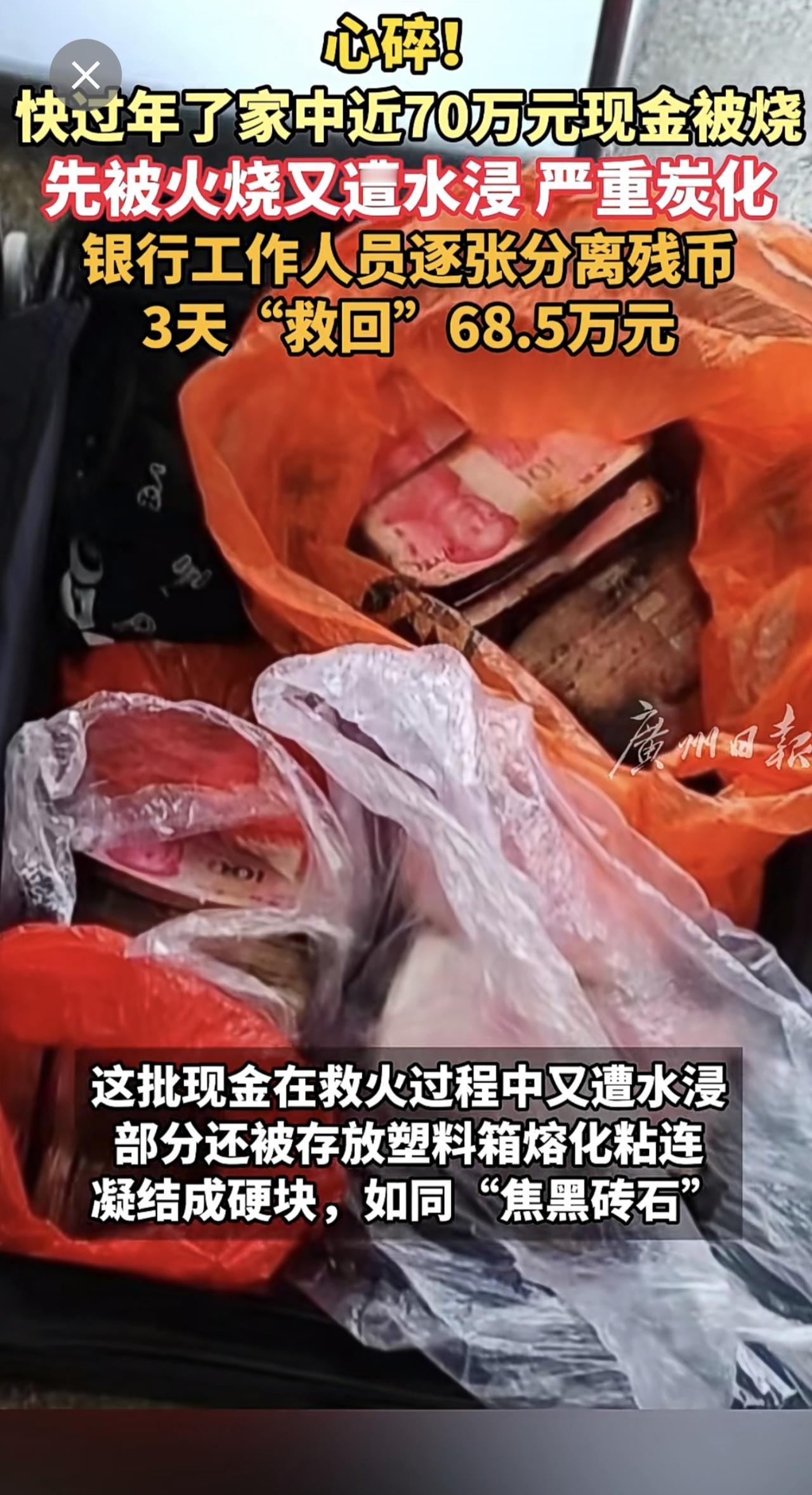 快过年了家中近70万元现金被烧 银行工作人员3天“救回”68.5万元