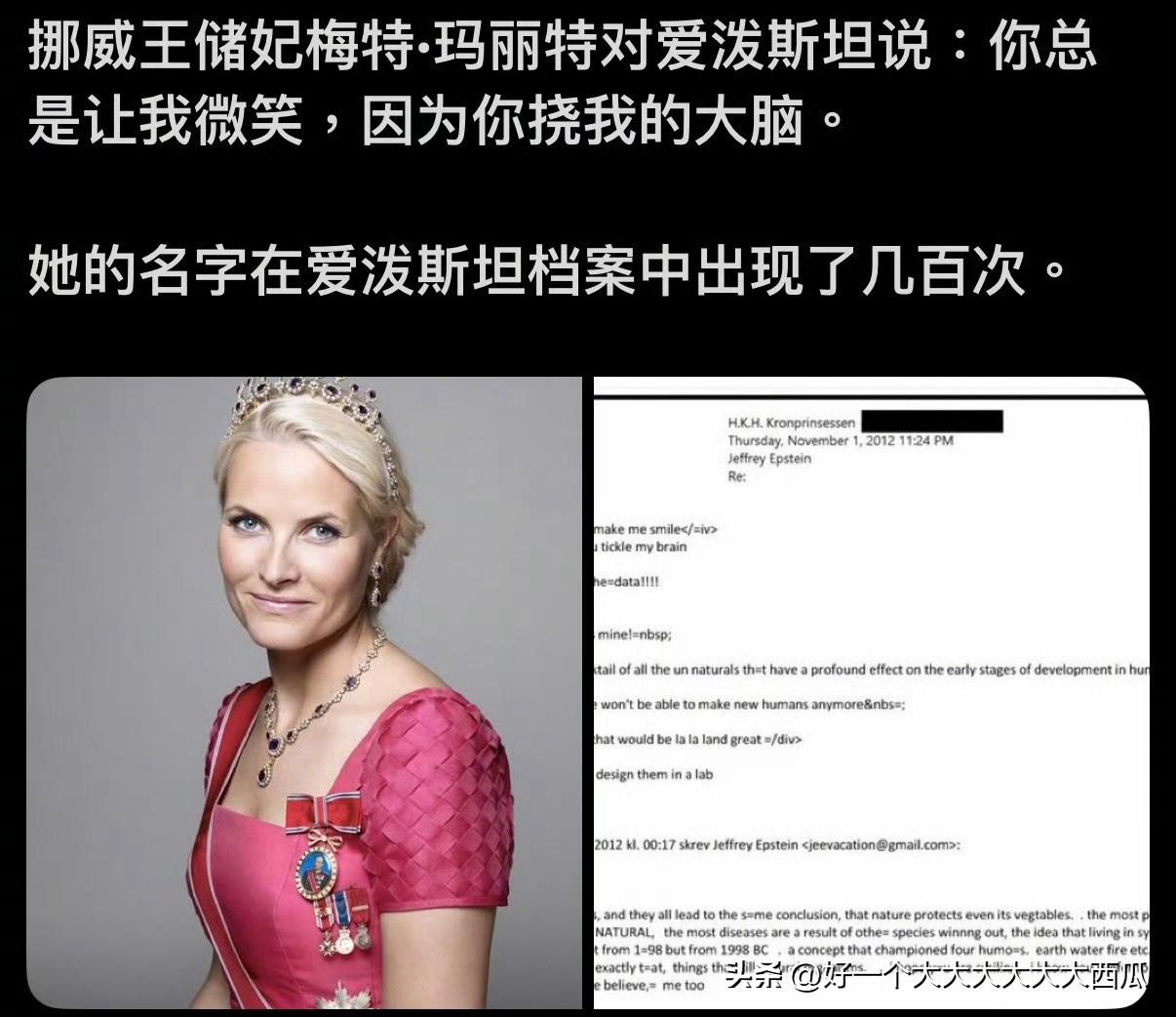 王妃也去了爱泼斯坦的小岛? 挪威王妃玛丽特曾多次去了爱泼斯坦小岛, 文件中王妃的名字出现次数多达上百次, 而且挪威王室也证实了这一点, 但是他们的说法是爱泼斯坦给王妃推荐了牙医。 那么王妃这种身份去那里到底是做什么? 这跟网上流传得越来越广的关于“吃人”的说法越来越接近, 这才是真正的让人细思极恐。