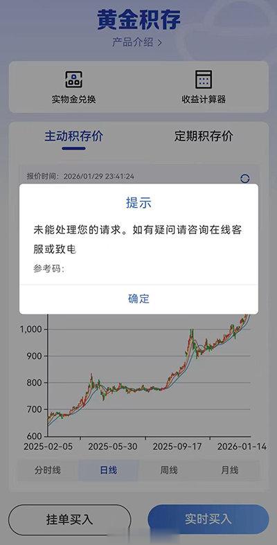 记者了解到,积存金交易失败时,部分银行页面显示“交易火爆或当前交易流量激增,请稍后再试”“当前访问人数过多,请您稍后尝试”“未能处理您的请求,如有疑问请咨询在线客服或致电”。