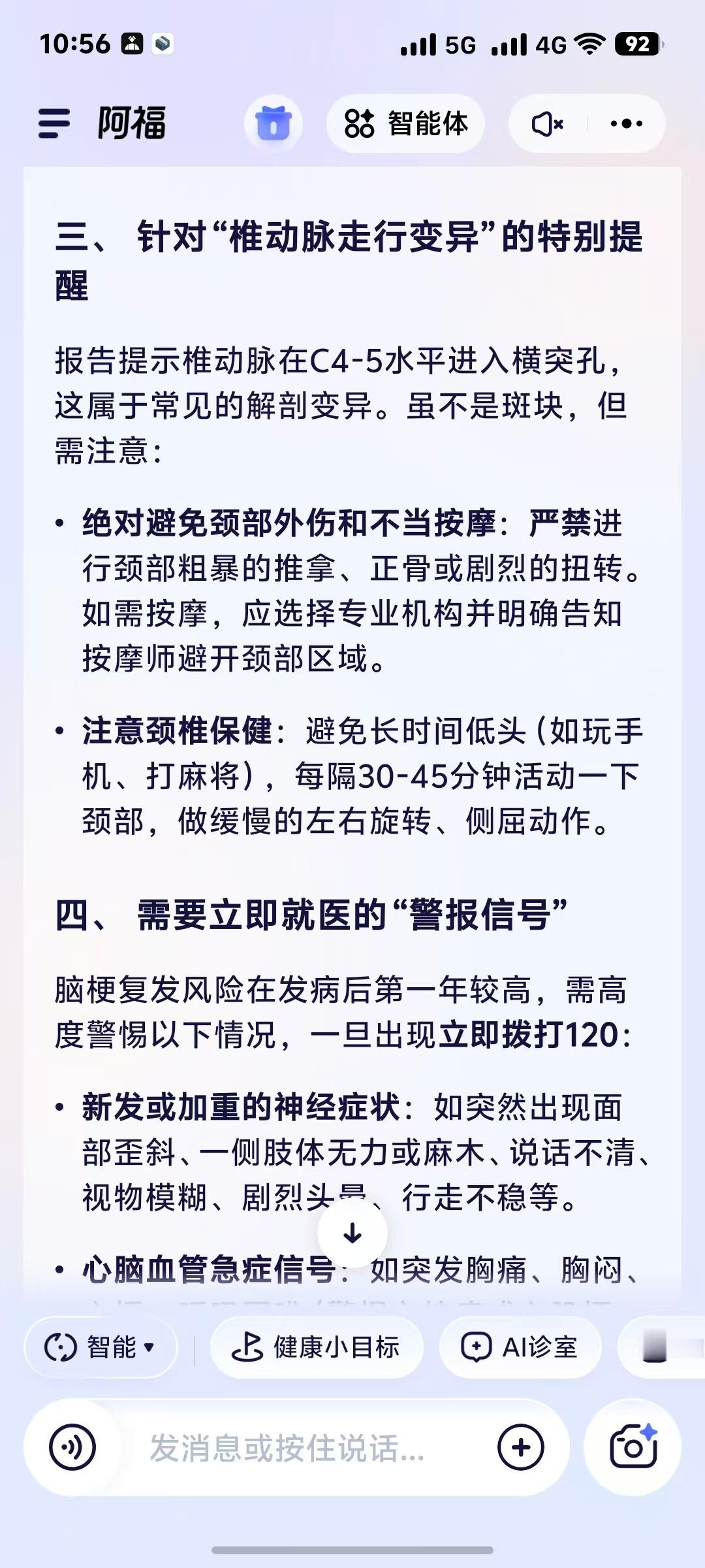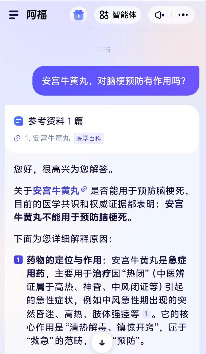 回家发现爸妈都在用阿福 之前有家属得了脑梗,还好程度比较轻。主要影响说话和单只手的活动,已经恢复的差不多了。用阿福做了个康复计划还是蛮靠谱的。特别是日常饮食管理部分,正好让老人改掉一些吃剩菜的坏习惯,也能多吃些优质蛋白和蔬菜水果。住院时,同病房的病友还给推荐日常要吃安宫牛黄丸,说的很神。嗯,反正阿福给的风险提醒也都给老人看了。之前听说阿福老年用户能占三分之一,还是可以的,给的建议总比那些群里乱传的文章要强多了。打击谣言其实也是AI应用的一个比较好的方向。