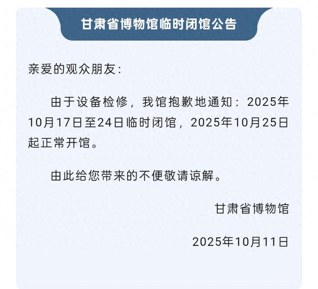 因设备检修工作需要,甘肃省博物馆将于2026年2月14日至2月16日闭馆,2月17日(正月初一)起恢复正常开放。