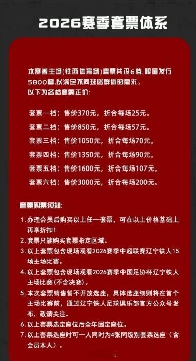 中超联赛 辽宁铁人2026赛季主场票务方案,卖到3月10日: