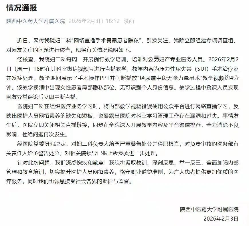 陕西西安一医院在为女病人做手术直播时,由于没有考虑到发酵的后果那么严重,直播的时候有几万人在线观看,其中暴露出病人的隐私部位。现在处理结果出来了,真的是万不该,希望这件事情在全国各地引起关注,以后千万不要发生这样的情况!以上仅供参考,属个人意见。