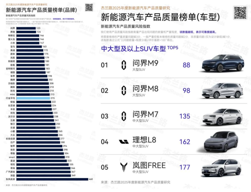 近日,杰兰路发布《2025年乘用车品牌单车成交均价与销售额报告》,报告显示,2025年问界单车成交均价达38.6万元,位列新势力品牌成交均价第一名;同时,全年累计销量超42万辆,成交均价与销量连续两年实现增长,形成“量价双升”昂扬曲线。 2026年1月,全系车型交付达40016辆,同比增长83%。截至目前,问界M9交付突破27万辆,累计21个月稳居50万元以上豪华车销量第一。问界M8上市8个月累计交付突破15万辆,连续6个月稳居40万级车型销量标杆。问界M7全系累计交付超42万辆,上市104天累计交付突破7万辆。 此外,在杰兰路《2025年度新能源汽车产品质量研究报告》中,问界荣登新能源汽车产品质量榜单(品牌)第一,其旗下车型问界M9、问界M8、问界M7更在新能源汽车产品质量榜单(车型)中包揽中大型及以上SUV车型前三名。 在用户口碑方面,在前不久杰兰路发布的《2025下半年新能源汽车品牌健康研究报告》中,问界荣获品牌NPS(净推荐值)第一、品牌发展信心指数第一、30万元以上品牌百人青睐指数第一,问界M9获得车型NPS (净推荐值) 第一,连续四次蝉联NPS(净推荐值)第一。【来自懂车帝车友圈】