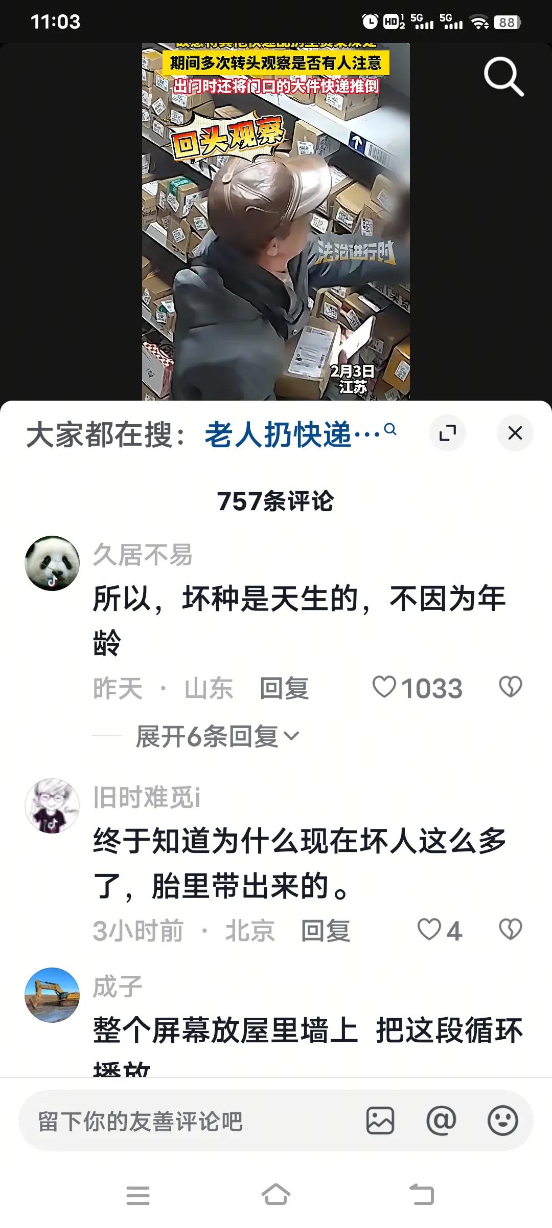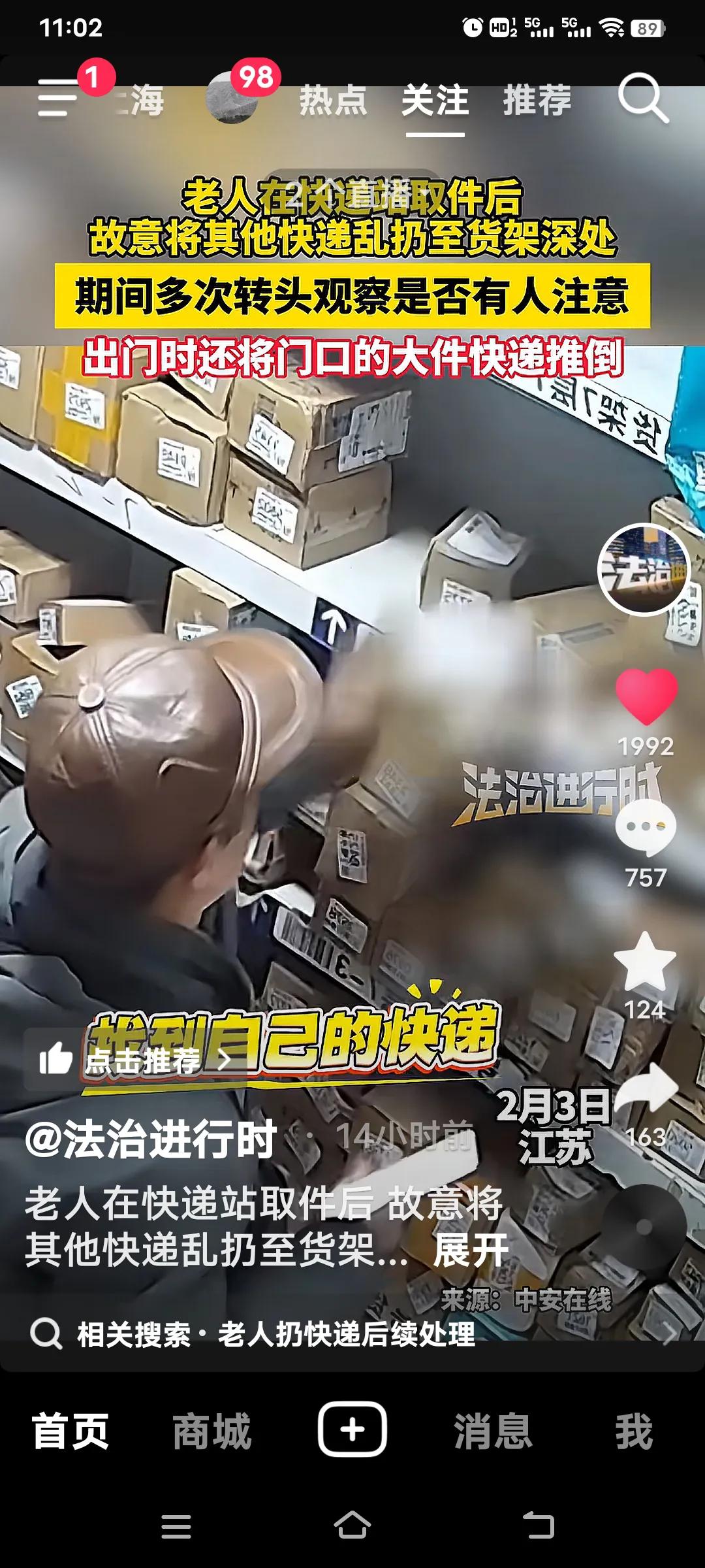 大家瞧瞧镜头下的这一幕,就明白为啥快递老是找不到了! 一位老人先把自己的快递拿在手里,接着将其他快递肆意乱扔乱抛,还回头张望是否有人进来。他哪里晓得,监控把这一切都看得清清楚楚!评论区有网友说:“终于明白为啥现在坏人这么多了,原来是天生的。” 这话一点不假。所以,当你不了解一个人时,别因对方的年龄就心生同情。就像这位老人,还是个大男人,竟做出这种事。怪不得好多人都难寻快递,竟还有这般操作,实在太可恨! 离奇快递事件 老家神秘快递 快递物品丢失