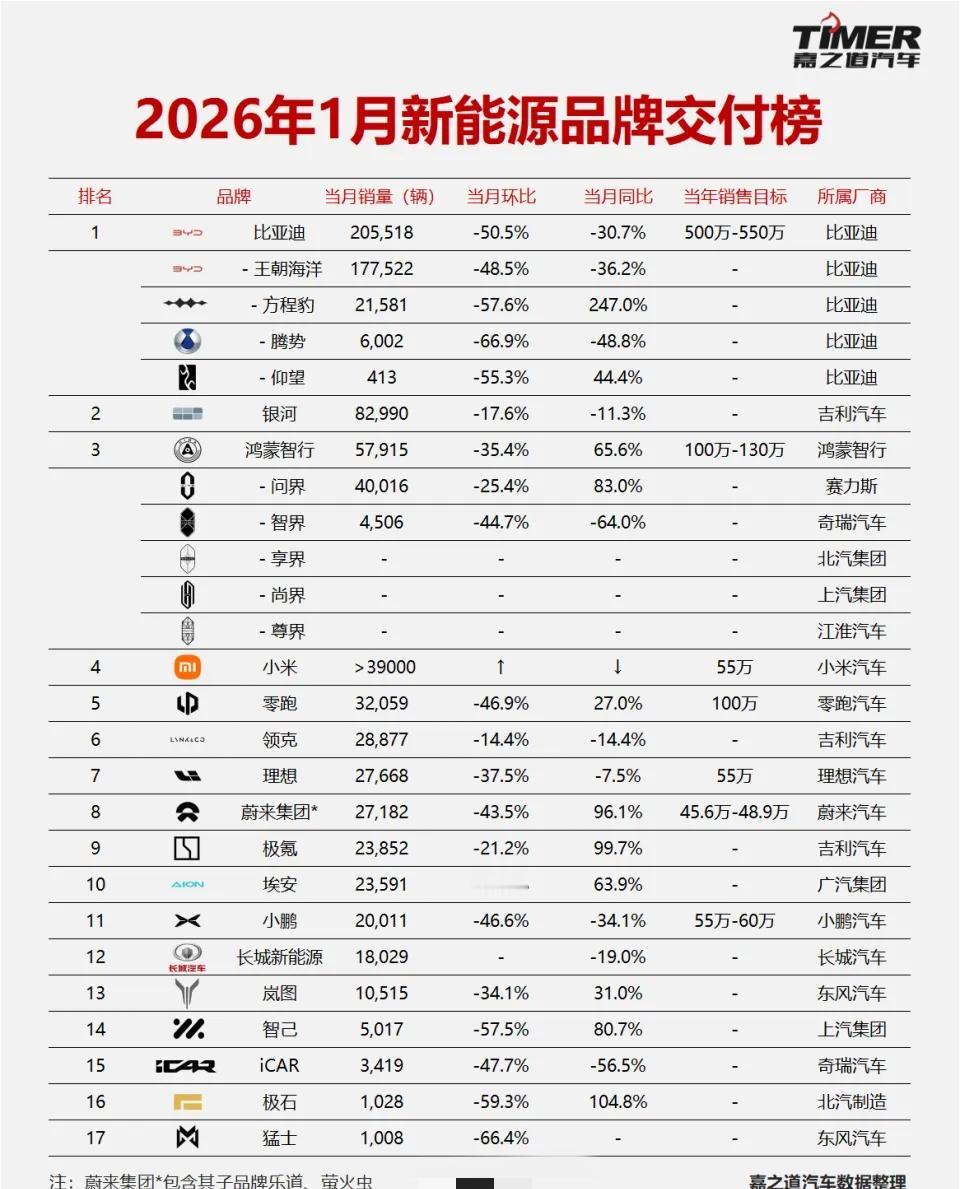 都在跌!谁才是王者?2026开年新能源交付榜出炉,环比普跌! 2026年1月新能源交付榜出炉,行业环比大幅下滑,同比分化明显。比亚迪20.6万辆夺冠,环比腰斩、同比降30.7%;吉利银河8.3万辆居次,韧性突出。鸿蒙智行同比增65.6%,问界成支柱;小米3.9万辆稳居第一阵营。零跑、蔚来同比高增,理想开局平淡。市场遇冷下,谁才是真正的王者?