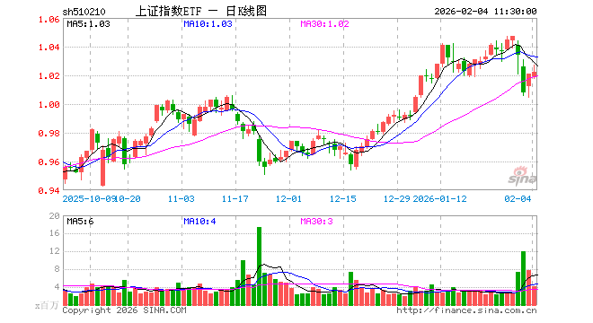 2月4日,截止午间收盘,上证指数ETF(510210)涨0.10%,报1.022元,成交额4.19亿元。上证指数ETF(510210)重仓股方面,农业银行截止午盘跌0.45%,中国石油涨0.96%,贵州茅台涨2.01%,工业富联跌4.65%,中国银行涨0.95%,紫金矿业涨0.05%,中国神华涨6.16%,中国人寿涨0.21%,招商银行涨0.99%,中国平安跌0.11%。
