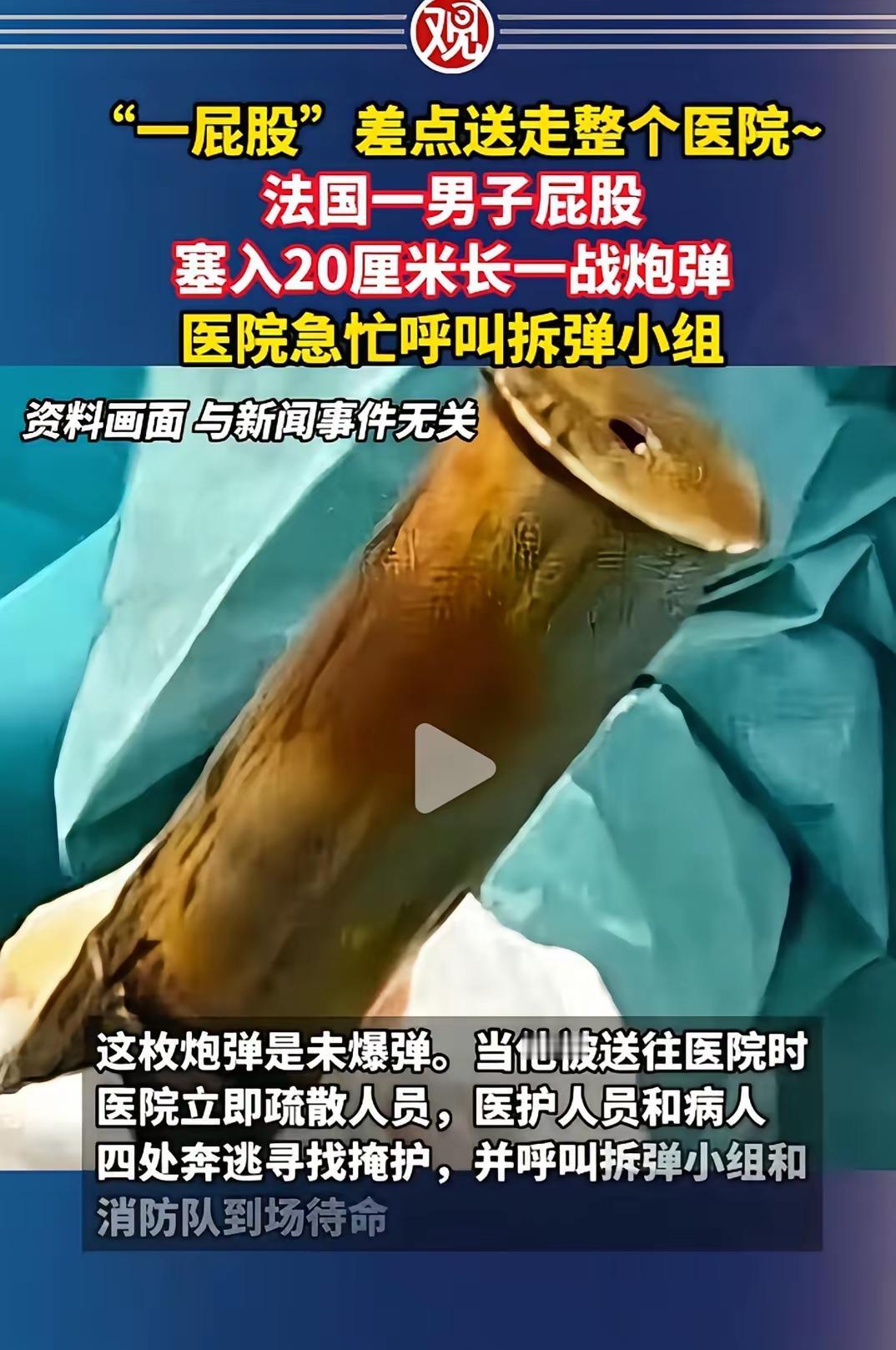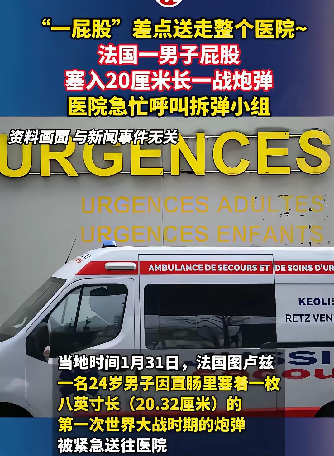 这可比留法小分队玩的野,法国狠人用一战炮弹“爆菊”,医院秒变拆弹现场。 当这名24岁法国男子捂着屁股冲进图卢兹医院急诊时,没人能想到,医生的听诊器还没贴上胸口,就先接到了“拆弹预警”。 一枚20厘米长的一战未爆炮弹,被他硬生生塞进了直肠。这操作直接把医院干成了反恐现场——医护人员带着病人四散奔逃,拆弹小组和消防车呼啸而至。 整栋楼的人都在思考一个终极问题:这位仁兄到底是怎么把炮弹精准送入“禁区”的?是酒后勇闯军火库,还是把战壕遗物当成了情趣玩具? 更讽刺的是,这枚本该在百年前就炸响的炮弹,最终在一个法国男人的直肠里,完成了它迟到的“威慑力”。 医院疏散的不仅是病人,更是对人类迷惑行为的集体投降。 等炮弹安全取出后,警察还要对他进行讯问。不知道他们是该先调查非法持有军火,还是先查查他的精神状态? 毕竟能把炮弹当“玩具”的狠人,全世界也找不出第二个了。