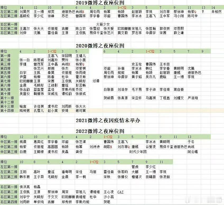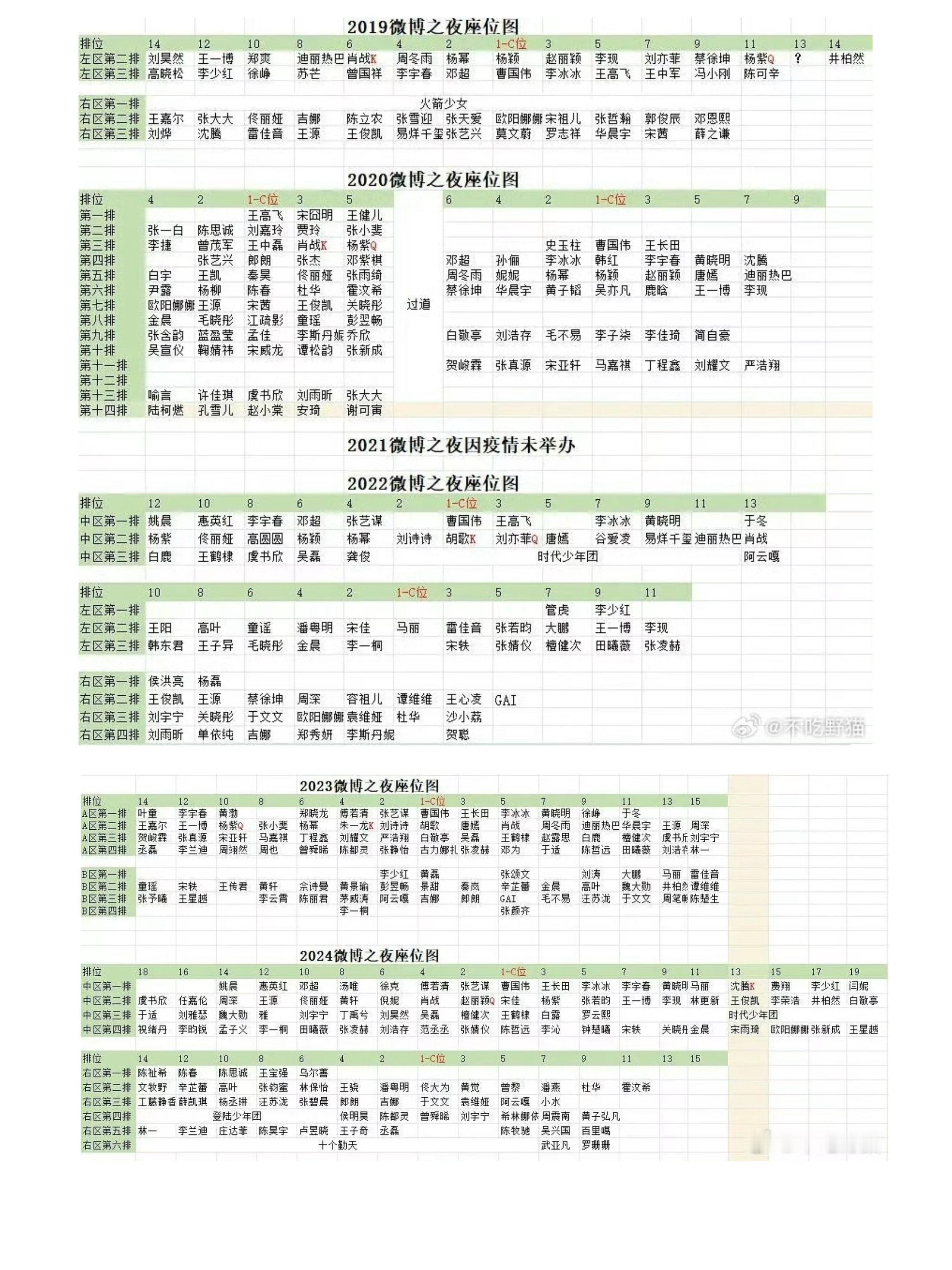从2019年到2025年微博之夜座位图,看看流量咖位更迭。综合看,85花咖位,一
