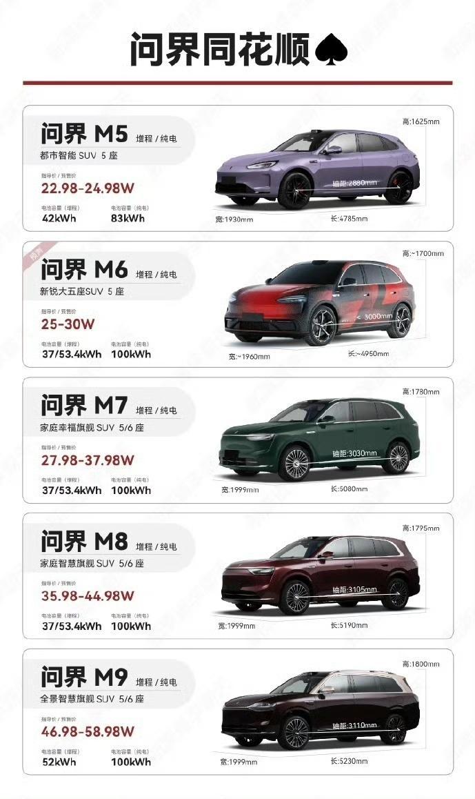 问界M6实力登场问界家族同花顺凑齐了,要说今年新能源SUV的最大黑马就是问界M6吧!前脸设计直接颠覆认知,家族化大灯配跑车级大嘴巴,赛道感拉满彻底甩掉老气感,年轻范儿直接拉满!华为黑科技全配齐,乾崑ADS 4.0智驾+鸿蒙座舱5.0拉满智能体验,增程纯电双动力还带800V超充,大五座空间家用超合适!网传起售价23万级,这价格配上满配配置,妥妥的25万级杀手锏,这波谁能顶得住?