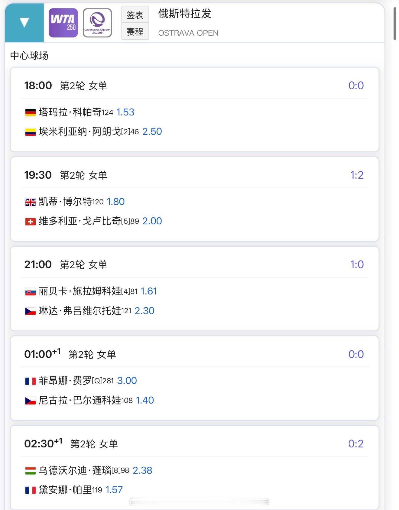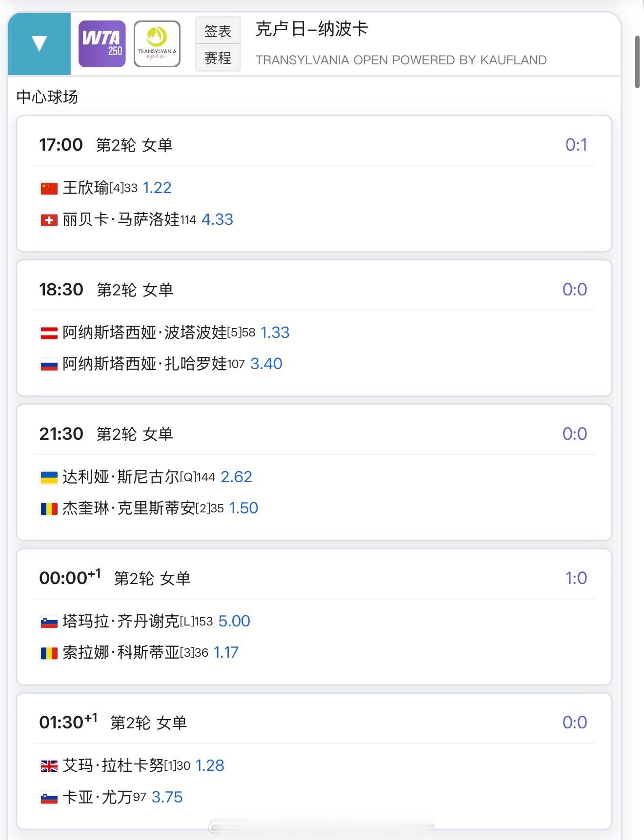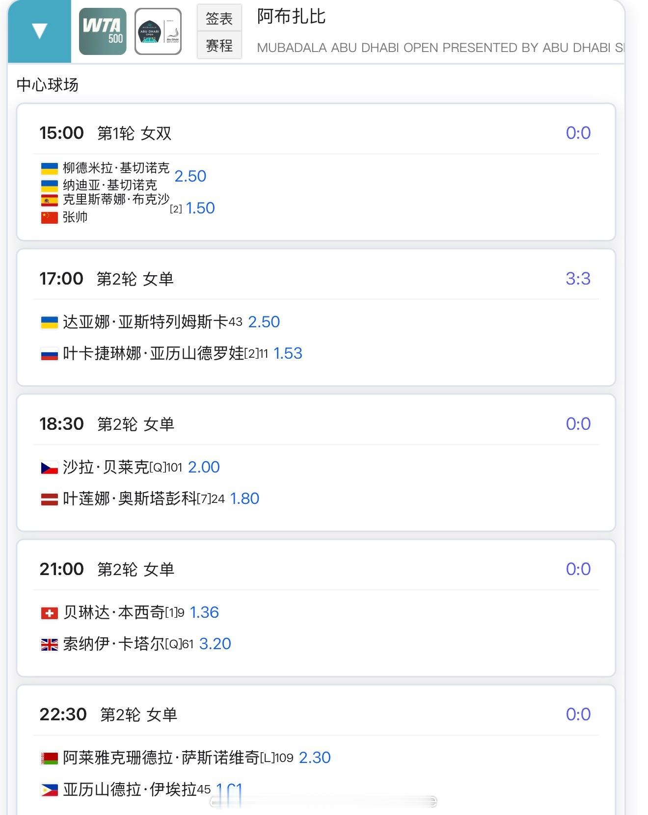 15:00张帅女双17:00王欣瑜vs马萨洛娃23:30埃拉vs萨斯诺维奇