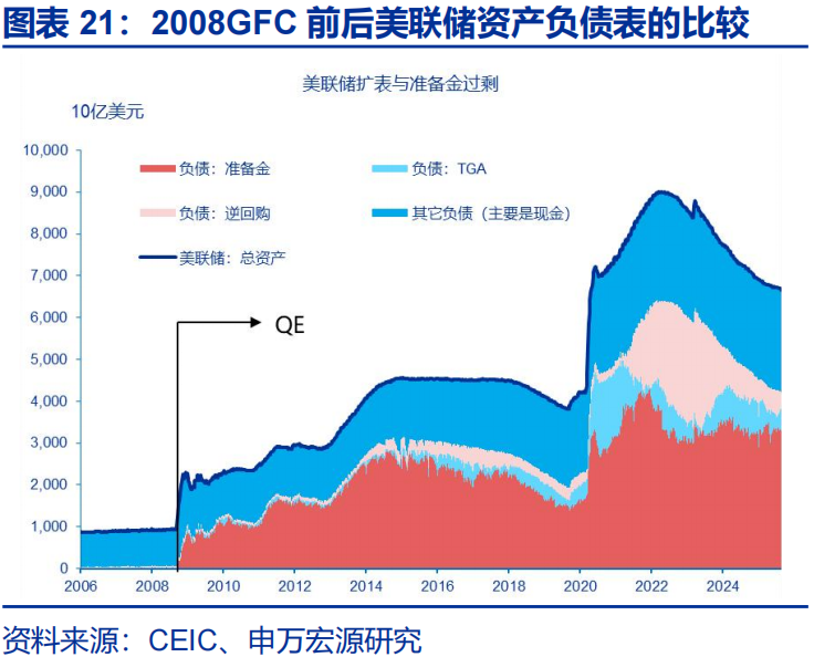 2008年全球金融危机(GFC)以来,美联储资产负债表扩张“一发不可收拾”。2008-2026年,美联储共实施了四轮扩表(QE)和两轮缩表(量化紧缩,QT),期间还包括一轮再投资和两轮准备金管理购买(RMP)。截止到2025年11月QT2结束,美联储总资产仍高达6.6万亿美元,是2008年初的7倍有余,是2019年9月QT1结束时的1.7倍。