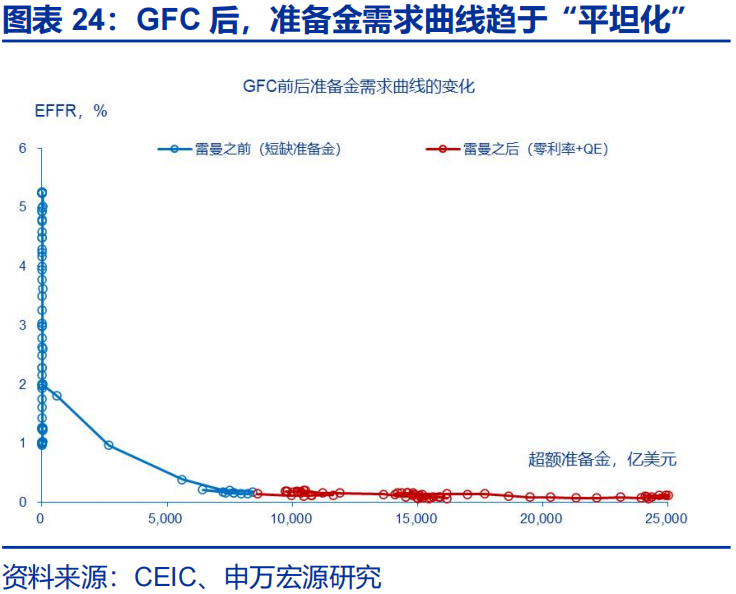 QE的直接结果是准备金供给过剩和准备金需求曲线的平坦化,美联储不得不改变利率控制策略。2008年GFC后,美联储快速降息至零,而后开启QE。3轮QE后,美联储总资产从不足1万亿上升到了约4.5万亿,超额准备金从200亿增加到了2.8万亿——超额准备金供给从短缺到过剩、准备金需求曲线从陡峭转向“平坦”。2020年3月,美联储将(非个人定期存款)法定准备金率从3%下调至0,宣告法定准备金制度退出历史舞台11。