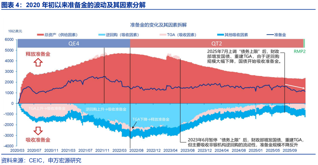 QT的核心是准备金的起伏,而非总资产规模的大小:准备金是否“充足”决定了美联储QT的进程和终点,进而也决定了重启扩表的起点。基于一般会计原理,作为美联储负债的准备金,与资产同向变化,与其他负债反向变化。所以,准备金的下降既可能源自QT(供给减少),也可能源自其他负债的增加(吸收增加)——主要是逆回购(非银机构在美联储的存款)和财政部一般存款账户(TGA)。