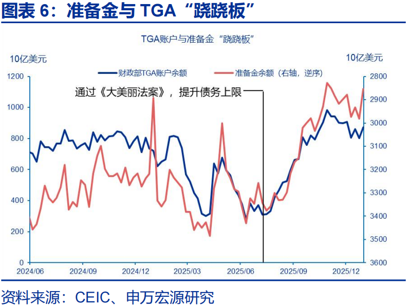 MMF主要配置逆回购和国库券(T-bills),既取决于利差,还受限于T-bills的供给:如果供给不足,则只能存放于美联储逆回购。所以,2023年6月暂停“债务上限”后,逆回购与TGA就表现出“跷跷板”特征。这是美联储缩表和财政部发债并未稀释准备金的主要解释。2025年7月提高“债务上限”后,由于逆回购所剩无几,财政部发债重建TGA便开始吸收准备金。