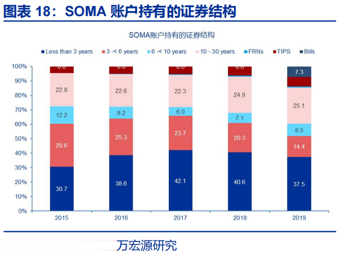 所以,2019年10月中旬之后,RMP和再投资也是同步推进的9,与2025年12月之后的情形类似。2019年8月美联储启动再投资计划之后,SOMA持有的国库券和中长期国债开始上行,10月中旬启动RMP之后,SOMA增持国库券的速度明显上行,以满足每月600亿美元的指引——再投资的规模受限于机构证券的到期规模和期限的分布,故只能依赖于RMP购买国库券的方式主动管理准备金。再投资购买的政府证券的期限按流通规模(面值)进行分配,以保持久期中性10。本次RMP的初始规模为400亿美元/月,较2019年少200亿,或因为准备金处于充足区间。与RMP1的一个区别是,RMP2的期限最长可以达到3年。