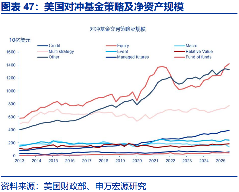具体到机构层面,以对冲基金(HF)为例。作为双边回购市场的重要借方,HF连接着货币市场与资本市场,是RMP如何影响资产定价的核心媒介。HF的交易行为提升了美股、美债市场的深度,改善了定价效率,但也放大了波动。HF常用的策略包括:股票多空(Long/ShortEquity)、国债基差(BasisTrade)与宏观策略(MacroStrategy)。其中,股票策略规模最大,截止到2025年9月底净资产规模为1.4万亿美元,占总规模(4.6万亿)的30.9%,占美股市值的1.9%23。由于主流HF的股票多头仓位多集中在前10大公司,所以在流动性过剩或短缺时,HF股票策略会分别强化股指的上涨与下跌。在流动性过剩时,事件驱动的TACO交易和BuytheDip策略会加速VIX的收敛,反之则反之。归纳而言,准备金供给或主要影响波动,基本面和无风险利率仍是基础性和方向性影响因素。