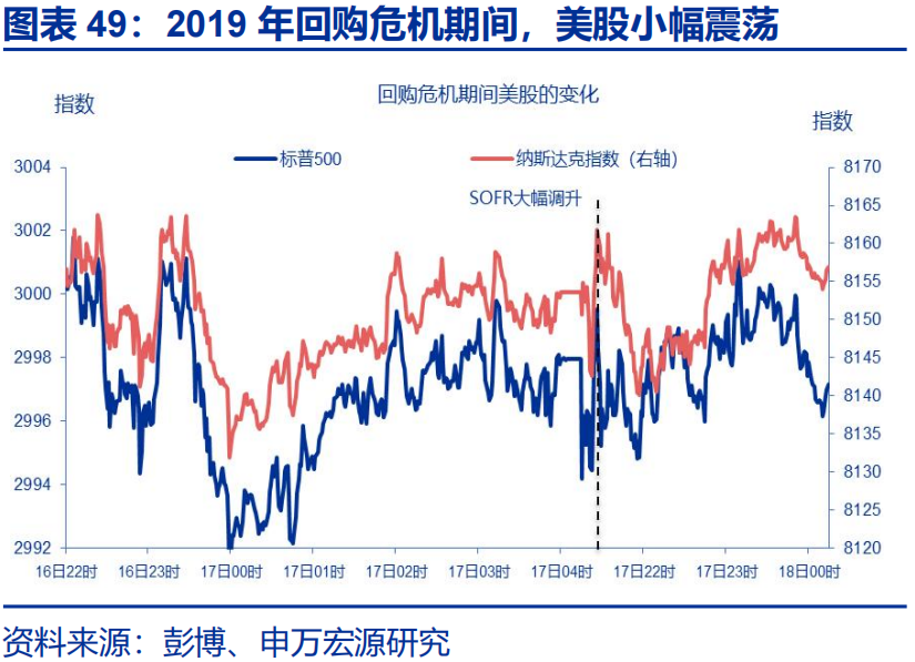 但是,只有当回购市场失灵演变为全市场“钱慌”级别的系统性危机时,才能对资本市场产生实质性冲击。9月17日盘中,SOFR一度暴涨至10%(9月17日均值5.25%,FFR目标区间为2-2.25%)。此后至2019年底,回购市场抵押贷款规模持续下降,10月美联储重启RMP后也未企稳。但是,回购危机对资本市场的外溢效应极为有限。美股和美债利率均表现为小幅震荡,未出现中枢的变化,波动率在出现跳升后也快速收敛。真正需要关注的情形是,某一外生冲击引发了货币市场流动性的“挤兑”,这表明风险偏好或已经降至“冰点”,并有可能进一步加剧风险资产抛售压力。