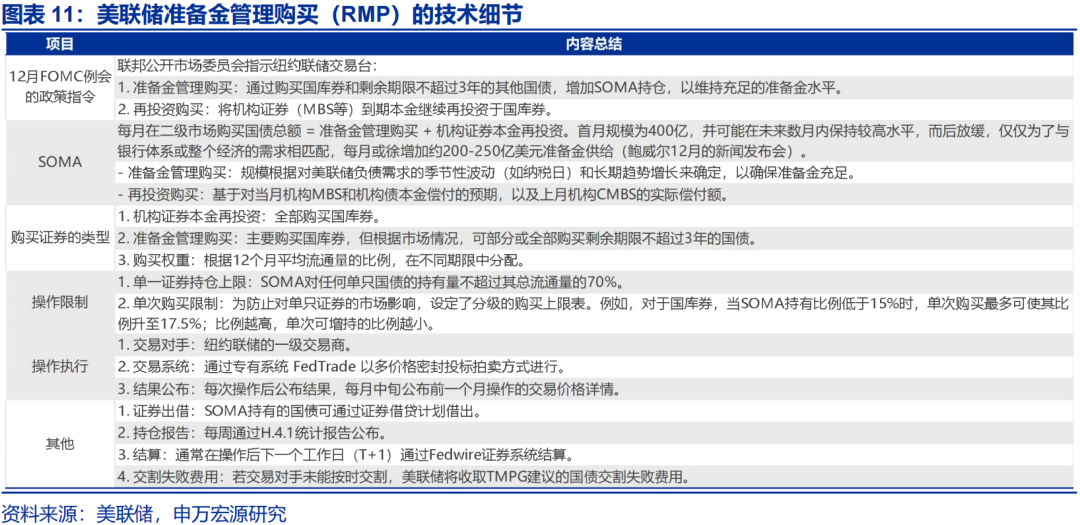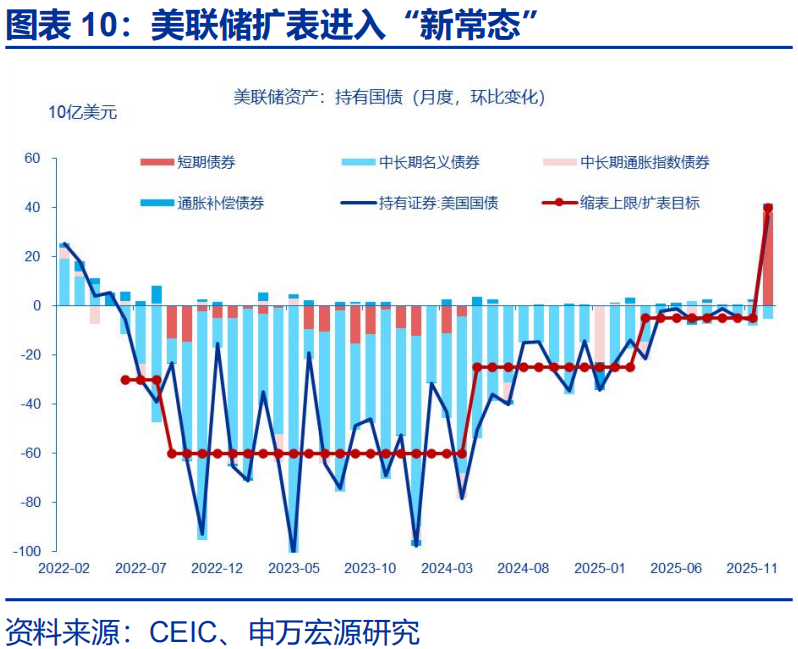 美联储扩表已进入“新常态”阶段,其提供现金和准备金的方式包括:准备金管理购买(RMP)和机构证券本金再投资。12月FOMC例会指示交易台从12月12日开始实施RMP,首月规模为400亿美元(再投资+净购买),预计2026年4月之前保持高位,此后速度可能放缓。在发布会的问答环节,鲍威尔估计,为了与银行体系或经济增速相匹配,仅此一项就要求每月增加约200-250亿美元——实际扩表的下限。期限主要为1年以内的国库券(75%为1-4个月,25%为4-12个月),根据需要可部分或全部购买剩余期限3年以内的国债,具体情况根据过往12个月的流通量(面值)动态分配。2025年12月,SOMA增持了约380亿美元国库券。