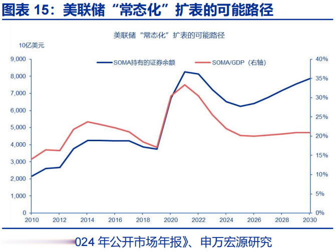 数量回答的是“买多少”问题。RMP的“反应函数”是金融机构的准备金需求+居民的现金需求,叠加国债交割、缴税等季节性因素的扰动。经验上看,准备金需求和现金需求都与名义GDP增速基本一致。所以,中期而言,RMP速度也与名义GDP增速基本一致。假设短期内美国名义GDP增速中枢维持5%,美联储每年或需增持国库券近3,000亿美元(月均250亿6)。实践中还需考虑扰动因素。RMP将遵循“长板原理”,在债券交割或报税截止日之前,SOMA增持国库券的规模或有抬升。纽约联储估计,在一定假设条件下,为维持充足准备金,SOMA持有的证券占GDP的比重约为20%-21%,准备金/GDP约等于8.7%——显然慢于QE式扩表的速度。