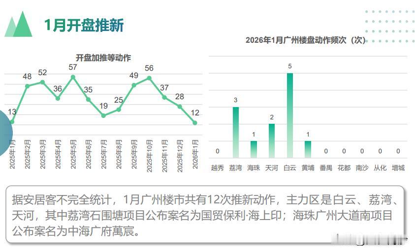 1月广州新房网签共4327套,成交量环比下降32.3%。从11个区域数据来看,黄埔区网签960套跃至榜首,增城区789套、番禺区532套位居二三位。南沙区成绩也不错,以491套位列第四名。 据安居客不完全统计,1月广州楼市共有12次推新动作,主力区是白云、荔湾、天河,其中荔湾石围塘项目公布案名为国贸保利·海上印;海珠广州大道南项目公布案名为中海广府萬宸。南沙区0推新。