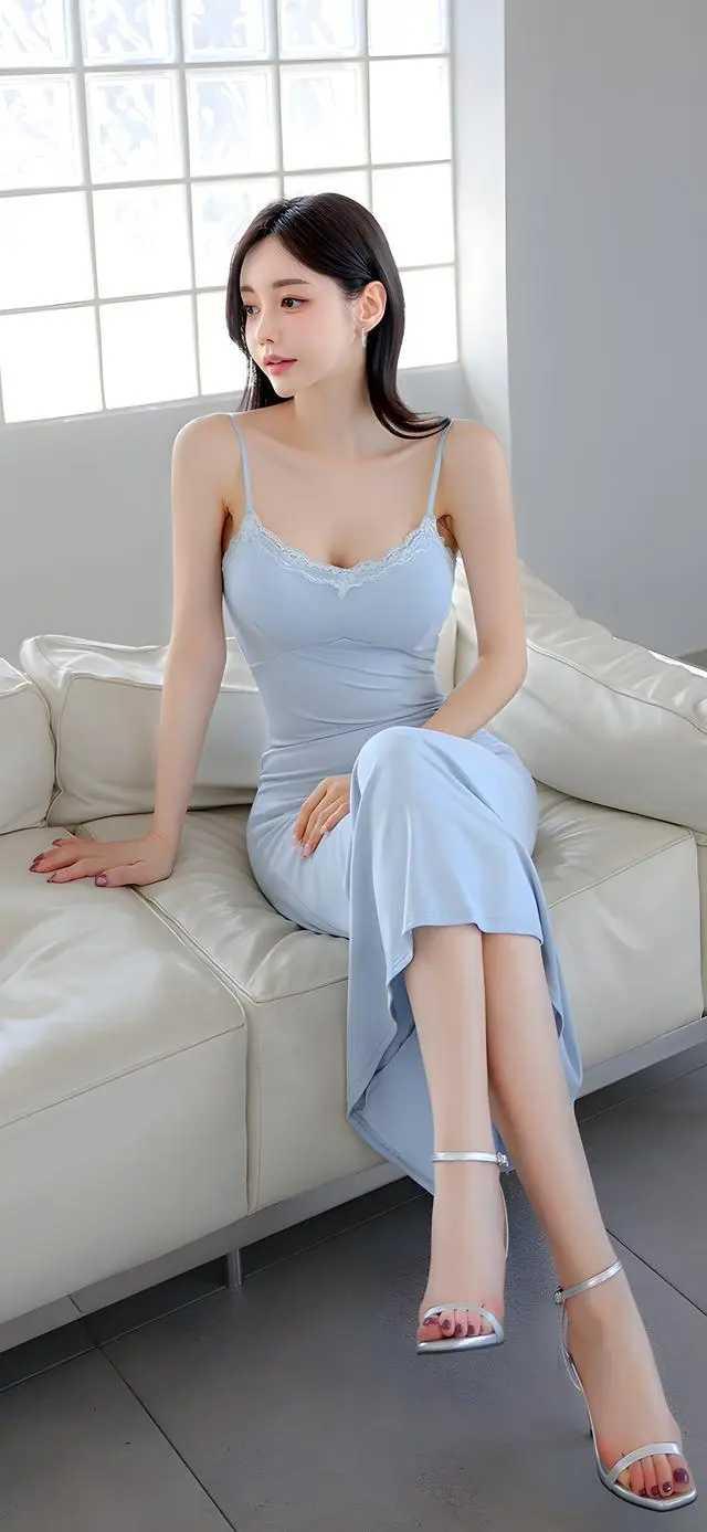 孙允珠,淡蓝色吊带长裙完美展现了她的优雅气质和身材优势。