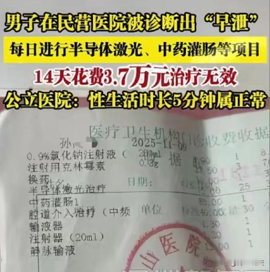 山东青岛,一男子38岁正值壮年,正是一个男人大好的时候,但是他自己感觉,跟妻子亲密的时候总力不从心,似乎无法让妻子满意,这就让他很困扰。作为男人,时常唉声叹气,总想着还是去治疗一下。他到网上找了个私人医院,一番治疗,14天就花去了3.7万元,不过,效果还是那样,就仍然还是5分钟。之后到了正规医院再检查,谁知道人家医生说:你这就是正常的,你没病。 (本新闻参考来源:红星新闻) 据报道称,男子感觉:这不就是坑我吗?我这么正常的一个男人,他们非要说我“有问题”。于是,就准备将那个私人的小医院给投诉一番。 青岛的一位38岁的孙先生,最近非常的忙碌,一直在医院里东奔西走。为什么呢,其实就是无中生有的事情而已。 作为一名38岁的壮年男子,这个年纪可能正是大好的阶段,不过,孙先生似乎缺少了一些自信。 每次跟妻子行使夫妻义务时,他总是觉得,不是很带劲,出啥问题了呢,原来孙先生觉得自己的时间不够长。 前前后后,一共也就5-6分钟的时间。 眼看着妻子似乎也不是很满足,孙先生内心急的啊,他感觉自己:我可能有病?! 于是孙先生就开始心虚的到网上去查询,一番搜索,竟然在网上找到了一个私人的小医院,弹窗出来,说可以帮助他解决困扰。 当时孙先生急于求成,也是被焦虑给冲昏了头脑,急的连口碑、效果、评价等等全都没有查询,孙先生直接就开车前往了这家医院。 检查之后,对方确实说:你有那方面的病。 然后就开始安排治疗,一番操作,14天的时间,花费了3.7万元治疗。对方说,孙先生下面有堵塞,需要使用仪器去疏通。 治疗期限过去之后,孙先生本想着,这下,自己应该没问题了吧? 于是当晚,又带着年轻时候的自信,孙先生又准备跟妻子实践一下,检测这次的效果。但还是只有5-6分钟。 这下,又给孙先生整不自信了,为啥还是没效果呢? 带着疑惑,孙先生这次来到了正规的医院检查,没想到医生给他的答复,令他大跌眼镜:5-6分钟,这就是正常的时间,你没病,正常的很! 听到这个结果,孙先生先是很欣慰,非常开心。但是转念一想,那个骗子医生,还让自己治疗了好几万的费用呢! 但是投诉之后,孙先生想到,那家医院的诊断证明、检查报告这些,全都没有给到自己啊。 再去跟医院协商的时候,对方也给出了答复:我们都是透明的,收费也是合理的,但是会给到一些费用的减免,可以退还部分。 孙先生表示,还有一些沟通的录音,如今他准备去做其他的鉴定,判定是否过度诊断。总之,可能到最后还是得走法律途径来维护自己的合法权益。 本案释法: 男子身体正常,但是前往私人诊所后,对方说男子身体有问题,过度医疗,就医费用高达3.7万元,而且院方也不提供检查报告跟收费票据。诊所的行为是否违法呢?男子应该如何维权? 第一、这家私人诊所可能涉嫌过度医疗、收费不够透明。 根据《基本医疗卫生与健康促进法》及《医疗纠纷预防和处理条例》可知,医务人员不可以开展跟疾病不相适应的诊疗活动,如果以此谋取利益,已经构成违法,可能会面临行政处罚甚至民事赔偿责任。 另外,这家医院拒绝给孙先生开票据、拒绝提供检查报告,也违反了《消费者权益保护法》,此举不仅侵犯了消费者的合法权益,还可能涉嫌伪造账目等问题。 第二、男子可以依法维权,要求对方做出民事赔偿。 男子可以先跟诊所沟通,如果对方拒绝赔偿,则可以根据程序展开追责。 在正规医院,医生已经给出诊断报告,男子身体正常,但是之前的医院却存在过度医疗的情况,收费也非常不合理,这些都可以成为索赔的关键证据。 孙先生可以向消协投诉,将这个小诊所的违法行为进行汇报,之后可以申请个人身体损害鉴定,在做出评估之后走法律途径维权。 对于本案,您怎么看待呢?不妨评论区里留言,一起来讨论吧!