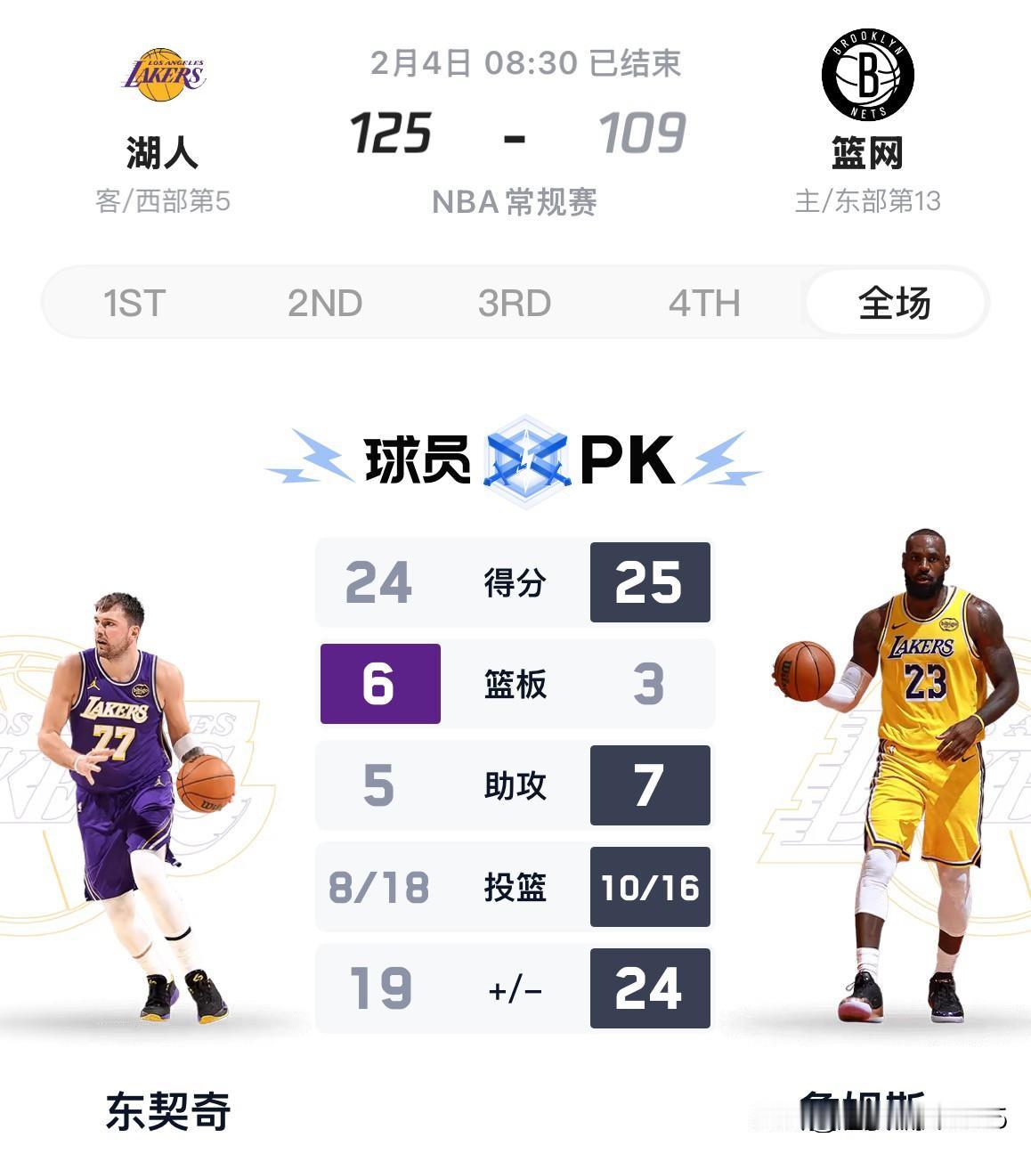 湖人大胜篮网排名重返西部第五,但真正的考验才刚刚开始,接下来一周主场连续战76人、勇士、雷霆、掘金,全明星赛前湖人能不能继续留在前六,取决这几场比赛的胜负。 今日湖人8连客的最后一个客场比赛,挑战篮网,里夫斯伤缺17场后以替补身份回归。首节湖人就建立起22分(45:23)的领先优势,上半场打完69:40领先29分。第三节湖人领先优势一度扩大到40+,湖人打得越来 越放松,所有队员都得到上场的机会,最终1 2 5:109大胜篮网,排名反超森林狼重返西部第五。 里夫斯今日打了近21分钟,9投3中(三分球5投1中)得到15分,另有4板1助2抢断,正负值+10。 詹东合砍49分9板12助,正负值分别为+1 9+24。
