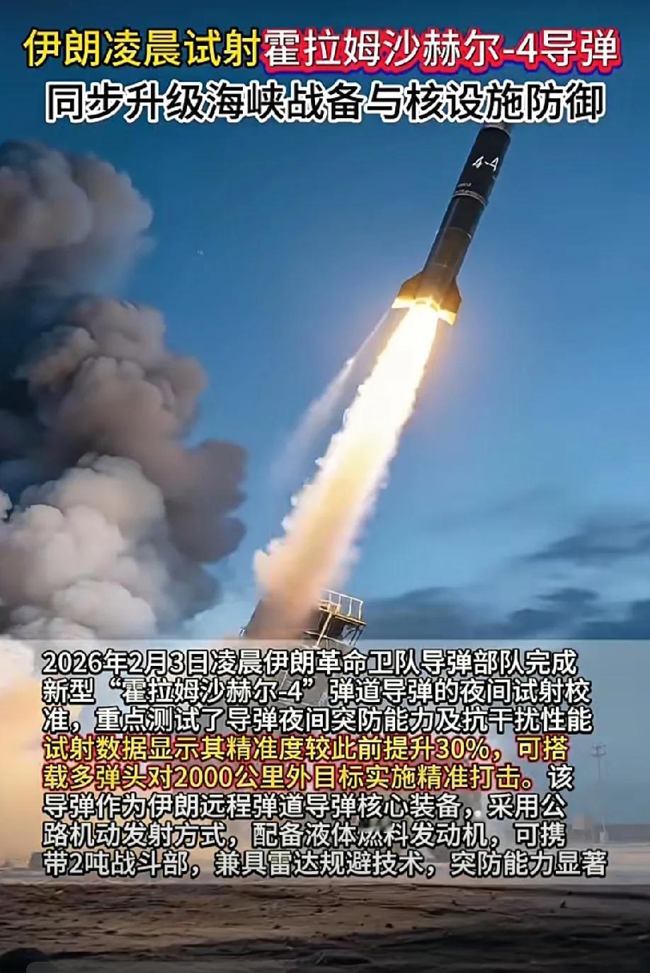 为应对美国军事威胁,德黑兰在做万全的准备。2月3日凌晨,伊朗革命卫队导弹部队完成新型“霍拉姆沙赫尔-4”弹道导弹的夜间试射校准,重点测试了导弹夜间突防能力及抗干扰性能,试射数据显示其精准度较此前提升30%,可搭载多弹头对2000公里外目标实施精准打击。该导弹作为伊朗远程弹道导弹核心装备,采用公路机动发射方式,配备液体燃料发动机,可携带2吨战斗部,兼具雷达规避技术,突防能力显著。