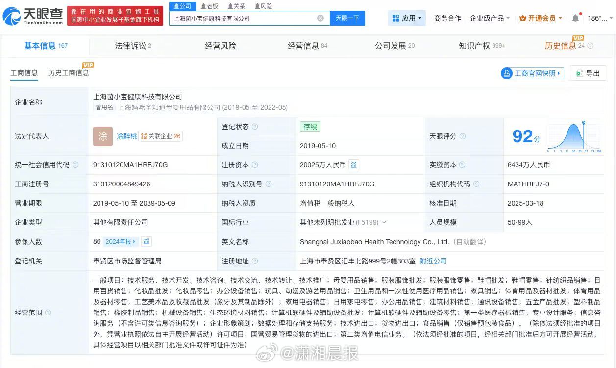 【#贾乃亮代言品牌被罚#,#贾乃亮代言品牌因不实内容被罚#】据报道,因宣称可改善妇科炎症等不实内容,日前,益生菌品牌菌小宝电商渠道经销商美惠生物科技(上海)有限公司被上海市崇明区市场监督管理局罚款3万元。记者天眼查工商信息发现,菌小宝关联上海菌小宝健康科技有限公司成立于2019年5月,法定代表人为涂醉桃,注册资本约2亿人民币,经营范围包括第一类医疗器械销售、专业设计服务等。股东信息显示,该公司由上海菌大宝企业管理咨询合伙企业(有限合伙)、上海菌小宝企业管理咨询合伙企业(有限合伙)等共同持股。菌小宝官网显示,菌小宝是益生菌品牌,公司总部设在上海市东方美谷大健康产业核心示范区,贾乃亮为品牌代言人。 上海