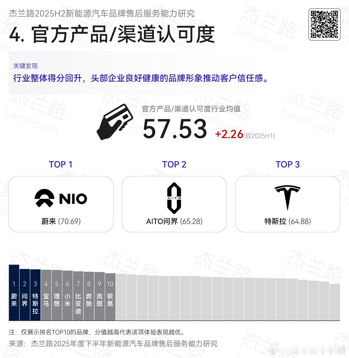 - 回店体验前三:蔚来、问界、理想- 技术质量前三:奔驰、特斯拉、问界- 服务权益前三:问界、蔚来、理想- 官方产品/渠道认可度前三:蔚来、问界、特斯拉
