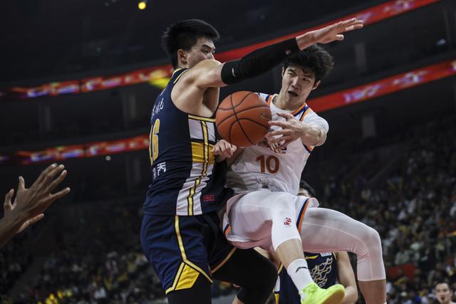 新华社照片,东莞(广东),2026年2月3日2月3日,上海久事队球员王哲林(右)上篮受阻。2月3日,在2025-2026赛季中国男子篮球职业联赛(CBA)第23轮比赛中,广东东阳光队主场84比94不敌上海久事队。新华社发(郑家雄摄)