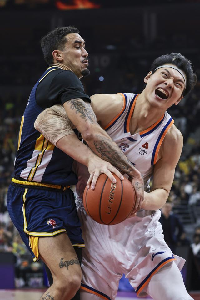 新华社照片,东莞(广东),2026年2月3日2月3日,上海久事队球员怀特塞德(左)进球后庆祝。2月3日,在2025-2026赛季中国男子篮球职业联赛(CBA)第23轮比赛中,广东东阳光队主场84比94不敌上海久事队。新华社发(郑家雄摄)